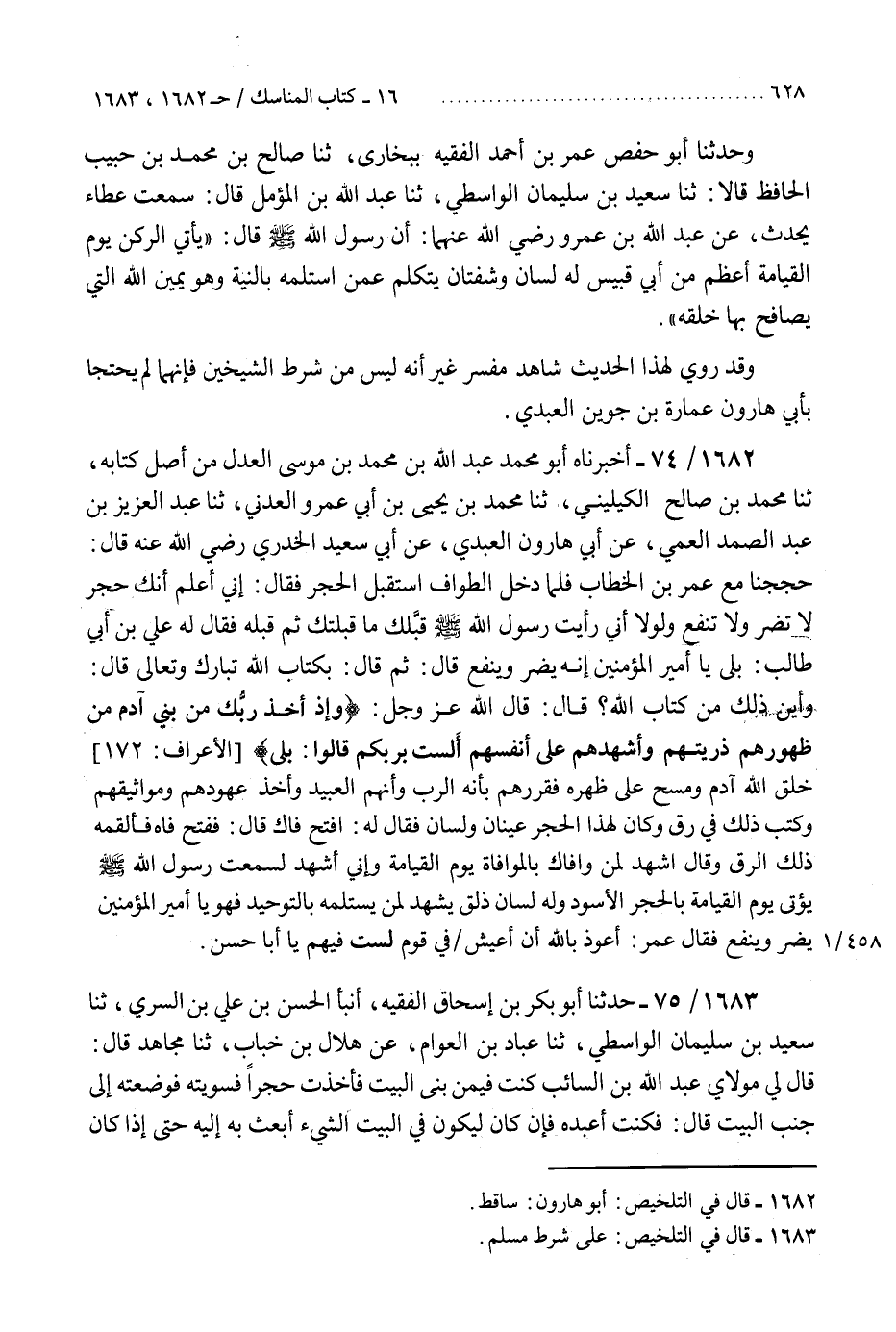 1682 - أَخْبَرْنَاهُ أَبُو مُحَمَّدٍ عَبْدُ اللَّهِ بْنُ مُحَمَّدِ بْنِ مُوسَى الْعَدْلُ، مِنْ أَصْلِ كِتَابِهِ، ثنا مُحَمَّدُ بْنُ صَالِحٍ الْكِيلِينِيُّ، ثنا مُحَمَّدُ بْنُ يَحْيَى بْنِ أَبِي عَمْرٍو الْعَدَنِيُّ، ثنا عَبْدُ الْعَزِيزِ بْنُ عَبْدِ الصَّمَدِ الْعَمِّيُّ، عَنْ أَبِي هَارُونَ الْعَبْدِيِّ، عَنْ أَبِي سَعِيدٍ الْخُدْرِيِّ، رَضِيَ اللَّهُ عَنْهُ، قَالَ: حَجَجْنَا مَعَ عُمَرَ بْنِ الْخَطَّابِ، فَلَمَّا دَخَلَ الطَّوَافَ اسْتَقْبَلَ الْحَجَرَ، فَقَالَ: إِنِّي أَعْلَمُ أَنَّكَ حَجَرٌ لَا تَضُرُّ، وَلَا تَنْفَعُ، وَلَوْلَا أَنِّي رَأَيْتُ رَسُولَ اللَّهِ صَلَّى اللهُ عَلَيْهِ وَسَلَّمَ قَبَّلَكَ مَا قَبَّلْتُكَ، ثُمَّ قَبَّلَهُ، فَقَالَ لَهُ عَلِيُّ بْنُ أَبِي طَالِبٍ بَلَى يَا أَمِيرَ الْمُؤْمِنِينَ إِنَّهُ يَضُرُّ وَيَنْفَعُ. قَالَ: ثُمَّ قَالَ: بِكِتَابِ اللَّهِ تَبَارَكَ وَتَعَالَى. قَالَ: وَأَيْنَ ذَلِكَ مِنْ كِتَابِ اللَّهِ؟ قَالَ: قَالَ اللَّهُ عَزَّ وَجَلَّ: {وَإِذْ أَخَذَ رَبُّكَ مِنْ بَنِي آدَمَ مِنْ ظُهُورِهِمْ ذُرِّيَّتَهُمْ، وَأَشْهَدَهُمْ عَلَى أَنْفُسِهِمْ أَلَسْتُ بِرَبِّكُمْ قَالُوا بَلَى} [الأعراف: 172] خَلَقَ اللَّهُ آدَمَ وَمَسَحَ عَلَى ظَهْرِهِ فَقَرَّرَهُمْ بِأَنَّهُ الرَّبُّ، وَأَنَّهُمُ الْعَبِيدُ، وَأَخَذَ عُهُودَهُمْ وَمَوَاثِيقَهُمْ، وَكَتَبَ ذَلِكَ فِي رَقٍّ، وَكَانَ لِهَذَا الْحَجَرِ عَيْنَانِ وَلِسَانٌ، فَقَالَ لَهُ افْتَحْ فَاكَ. قَالَ: فَفَتَحَ فَاهُ فَأَلْقَمَهُ ذَلِكَ الرَّقَّ وَقَالَ: اشْهَدْ لِمَنْ وَافَاكَ بِالْمُوافَاةِ يَوْمَ الْقِيَامَةِ، وَإِنِّي أَشْهَدُ لَسَمِعْتُ رَسُولَ اللَّهِ صَلَّى اللهُ عَلَيْهِ وَسَلَّمَ: «§يُؤْتَى يَوْمَ الْقِيَامَةِ بِالْحَجَرِ الْأَسْوَدِ، وَلَهُ لِسَانٌ ذَلْقٌ، يَشْهَدُ لِمَنْ يَسْتَلِمُهُ بِالتَّوْحِيدِ» فَهُوَ يَا أَمِيرَ الْمُؤْمِنِينَ يَضُرُّ وَيَنْفَعُ، فَقَالَ عُمَرُ: أَعُوذُ بِاللَّهِ أَنْ أَعِيشَ فِي قَوْمٍ لَسْتَ فِيهِمْ يَا أَبَا حَسَنٍ