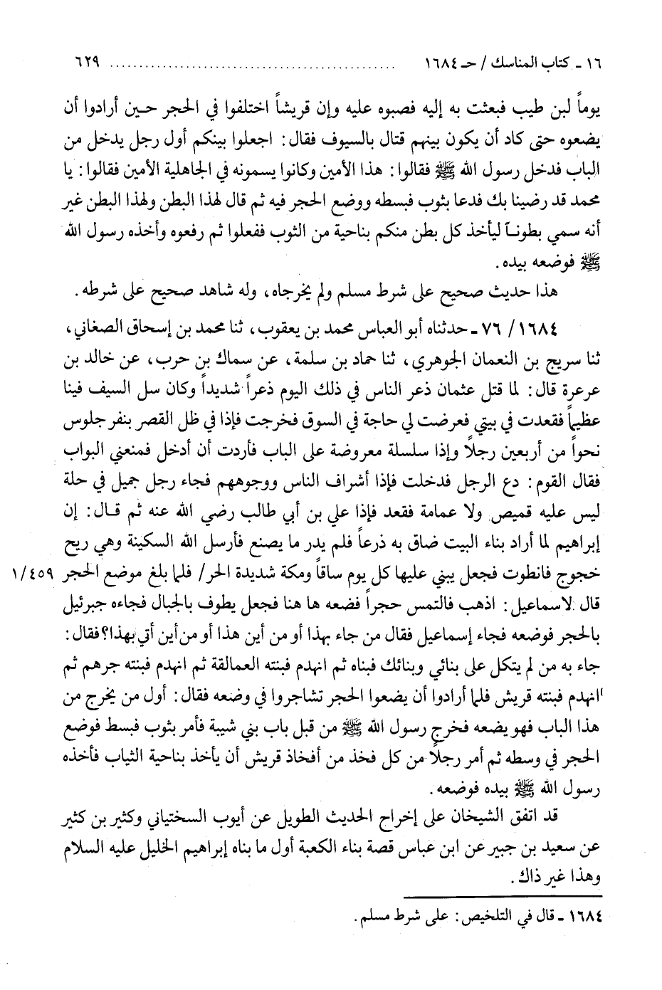 1684 - حَدَّثَنَاهُ أَبُو الْعَبَّاسِ مُحَمَّدُ بْنُ يَعْقُوبَ، ثنا مُحَمَّدُ بْنُ إِسْحَاقَ الصَّغَانِيُّ، ثنا سُرَيْجُ بْنُ النُّعْمَانِ الْجَوْهَرِيُّ، ثنا حَمَّادُ بْنُ سَلَمَةَ، عَنْ سِمَاكِ بْنِ حَرْبٍ، عَنْ خَالِدِ بْنِ عَرْعَرَةَ، قَالَ: لَمَّا قُتِلَ عُثْمَانُ ذُعِرَ النَّاسُ فِي ذَلِكَ الْيَوْمِ ذُعْرًا شَدِيدًا، وَكَانَ سَلُّ السَّيْفِ فِينَا عَظِيمًا، فَقَعَدْتُ فِي بَيْتِي، فَعَرَضَتْ لِي حَاجَةٌ فِي السُّوقِ فَخَرَجْتُ، فَإِذَا فِي ظِلِّ الْقَصْرِ بِنَفَرٍ جُلُوسٍ نَحْوًا مِنْ أَرْبَعِينَ رَجُلًا، وَإِذَا سِلْسِلَةٌ مَعْرُوضَةٌ عَلَى الْبَابِ، فَأَرَدْتُ أَنْ أَدْخُلَ فَمَنَعَنِي الْبَوَّابُ، فَقَالَ الْقَوْمُ: دَعِ الرَّجُلَ، فَدَخَلْتُ فَإِذَا أَشْرَافُ النَّاسِ وَوُجُوهُهُمْ، فَجَاءَ رَجُلٌ جَمِيلٌ فِي حُلَّةٍ لَيْسَ عَلَيْهِ قَمِيصٌ وَلَا عِمَامَةٌ، فَقَعَدَ، فَإِذَا عَلِيُّ بْنُ أَبِي طَالِبٍ رَضِيَ اللَّهُ عَنْهُ، ثُمَّ قَالَ: إِنَّ إِبْرَاهِيمَ لَمَّا أَرَادَ بِنَاءَ الْبَيْتِ ضَاقَ بِهِ ذَرْعًا، فَلَمْ يَدْرِ مَا يَصْنَعُ، فَأَرْسَلَ اللَّهُ السَّكِينَةَ: وَهِيَ رِيحٌ خَجُوجٌ، فَانْطَوَتْ فَجَعَلَ يَبْنِي عَلَيْهَا كُلَّ يَوْمٍ سَاقًا وَمَكَّةُ شَدِيدَةُ الْحَرِّ، فَلَمَّا بَلَغَ مَوْضِعَ الْحَجَرِ، قَالَ لِإِسْمَاعِيلَ اذْهَبْ فَالْتَمِسْ حَجَرًا فَضَعْهُ هَا هُنَا، فَجَعَلَ يَطُوفُ بِالْجِبَالِ فَجَاءَهُ جِبْرِيلُ بِالْحَجَرِ، فَوَضَعَهُ فَجَاءَ إِسْمَاعِيلُ، فَقَالَ: مَنْ جَاءَ بِهَذَا؟ - أَوْ مِنْ أَيْنَ هَذَا؟، أَوْ مِنْ أَيْنَ أُتِيَ بِهَذَا؟ - فَقَالَ: جَاءَ بِهِ مَنْ لَمْ يَتَّكِلْ عَلَى بِنَائِي وَبِنَائِكَ فَبَنَاهُ، ثُمَّ انْهَدَمَ، فَبَنَتْهُ الْعَمَالِقَةُ، ثُمَّ انْهَدَمَ فَبَنَتْهُ جُرْهُمٌ، ثُمَّ انْهَدَمَ فَبَنَتْهُ قُرَيْشٌ، فَلَمَّا أَرَادُوا أَنْ يَضَعُوا الْحَجَرَ تَشَاجَرُوا فِي وَضْعِهِ، فَقَالَ: أَوَّلُ مَنْ يَخْرُجُ مِنْ هَذَا الْبَابِ فَهُوَ يَضَعُهُ، «فَخَرَجَ رَسُولُ اللَّهِ صَلَّى اللهُ عَلَيْهِ وَسَلَّمَ مِنْ قِبَلِ بَابِ بَنِي شَيْبَةَ، §فَأَمَرَ بِثَوْبٍ فَبُسِطَ فَوَضَعَ الْحَجَرَ فِي وَسَطِهِ، ثُمَّ أَمَرَ رَجُلًا مِنْ كُلِّ فَخْذٍ مِنْ أَفْخَاذِ قُرَيْشٍ أَنْ يَأْخُذَ بِنَاحِيَةِ الثِّيَابِ، فَأَخَذَهُ رَسُولُ اللَّهِ صَلَّى اللهُ عَلَيْهِ وَسَلَّمَ بِيَدِهِ فَوَضَعَهُ» قَدِ اتَّفَقَ الشَّيْخَانِ عَلَى إِخْرَاجِ الْحَدِيثِ الطَّوِيلِ عَنْ أَيُّوبَ السَّخْتِيَانِيِّ، وَكَثِيرِ بْنِ كَثِيرٍ، عَنْ سَعِيدِ بْنِ جُبَيْرٍ، عَنِ ابْنِ عَبَّاسٍ قِصَّةُ بِنَاءِ الْكَعْبَةِ أَوَّلُ مَا بَنَاهُ إِبْرَاهِيمُ الْخَلِيلُ عَلَيْهِ السَّلَامُ، وَهَذَا غَيْرُ ذَاكَ "