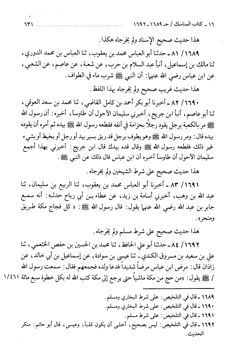 1689 - حَدَّثَنَا أَبُو الْعَبَّاسِ مُحَمَّدُ بْنُ يَعْقُوبَ، ثنا الْعَبَّاسُ بْنُ مُحَمَّدٍ الدُّورِيُّ، ثنا مَالِكُ بْنُ إِسْمَاعِيلَ، أَنْبَأَ عَبْدُ السَّلَامِ بْنُ حَرْبٍ، عَنْ شُعْبَةَ، عَنْ عَاصِمٍ، عَنِ الشَّعْبِيِّ، عَنِ ابْنِ عَبَّاسٍ، رَضِيَ اللَّهُ عَنْهُمَا، «أَنَّ النَّبِيَّ صَلَّى اللهُ عَلَيْهِ وَسَلَّمَ §شَرِبَ مَاءً فِي الطَّوَافِ» هَذَا حَدِيثٌ غَرِيبٌ صَحِيحٌ، وَلَمْ يُخَرِّجَاهُ بِهَذَا اللَّفْظِ "