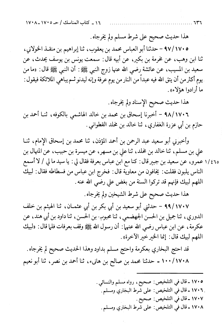 1706 - أَخْبَرَنَا إِسْحَاقُ بْنُ مُحَمَّدِ بْنِ خَالِدٍ الْهَاشِمِيُّ بِالْكُوفَةِ، ثنا أَحْمَدُ بْنُ حَازِمِ بْنِ أَبِي غَرْزَةَ الْغِفَارِيُّ، ثنا خَالِدُ بْنُ مَخْلَدٍ الْقَطَوَانِيُّ، وَأَخْبَرَنِي أَبُو سَعِيدٍ عَبْدُ الرَّحْمَنِ بْنُ أَحْمَدَ الْمُؤَذِّنُ، ثنا مُحَمَّدُ بْنُ إِسْحَاقَ الْإِمَامُ، ثنا عَلِيُّ بْنُ مُسْلِمٍ، ثنا خَالِدُ بْنُ مَخْلَدٍ، ثنا عَلِيُّ بْنُ مُسْهِرٍ، عَنْ مَيْسَرَةَ بْنِ حَبِيبٍ، عَنِ الْمِنْهَالِ بْنِ عَمْرٍو، عَنْ سَعِيدِ بْنِ جُبَيْرٍ، قَالَ: كُنَّا مَعَ ابْنِ عَبَّاسٍ بِعَرَفَةَ، فَقَالَ لِي: يَا سَيِّدُ مَا لِي لَا أَسْمَعُ النَّاسَ يُلَبُّونَ؟ فَقُلْتُ: يَخَافُونَ مِنْ مُعَاوِيَةَ، قَالَ: فَخَرَجَ ابْنُ عَبَّاسٍ مِنْ فُسْطَاطِهِ، فَقَالَ: «§لَبَّيْكَ اللَّهُمَّ لَبَّيْكَ، فَإِنَّهُمْ قَدْ تَرَكُوا السُّنَّةَ مِنْ بُغْضِ عَلِيٍّ رَضِيَ اللَّهُ عَنْهُ» هَذَا حَدِيثٌ صَحِيحٌ عَلَى شَرْطِ الشَّيْخَيْنِ، وَلَمْ يُخَرِّجَاهُ "