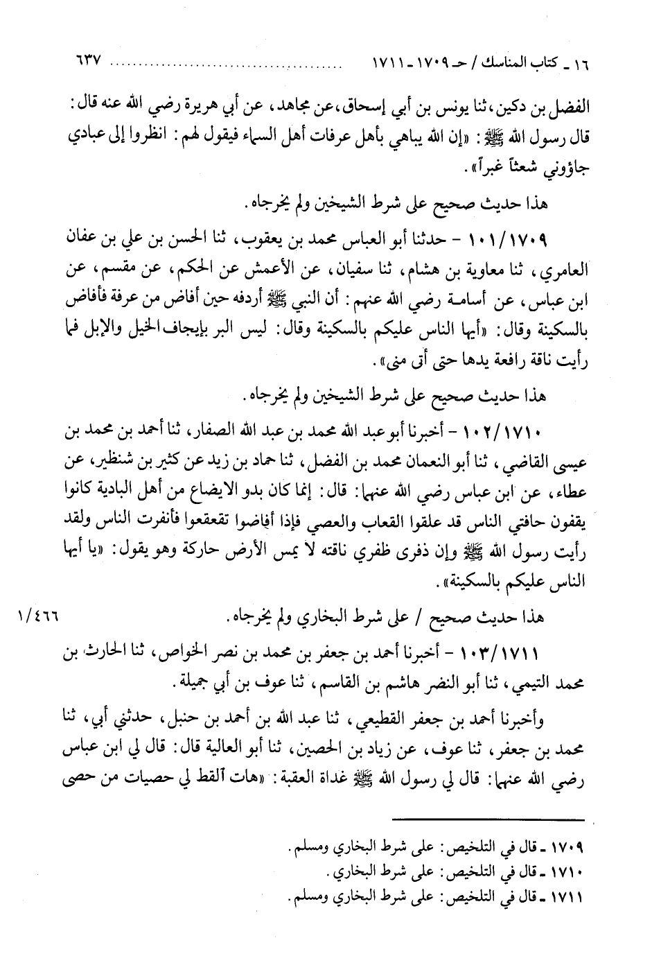1709 - حَدَّثَنَا أَبُو الْعَبَّاسِ مُحَمَّدُ بْنُ يَعْقُوبَ، ثنا الْحَسَنُ بْنُ عَلِيِّ بْنِ عَفَّانَ الْعَامِرِيُّ، ثنا مُعَاوِيَةُ بْنُ هِشَامٍ، ثنا سُفْيَانُ، عَنِ الْأَعْمَشِ، عَنِ الْحَكَمِ، عَنْ مِقْسَمٍ، عَنِ ابْنِ عَبَّاسٍ، عَنْ أُسَامَةَ رَضِيَ اللَّهُ عَنْهُمْ، «أَنَّ النَّبِيَّ صَلَّى اللهُ عَلَيْهِ وَسَلَّمَ أَرْدَفَهُ حِينَ أَفَاضَ مِنْ عَرَفَةَ فَأَفَاضَ بِالسَّكِينَةِ» ، وَقَالَ: " أَيُّهَا النَّاسُ، §عَلَيْكُمْ بِالسَّكِينَةِ وَقَالَ: «لَيْسَ الْبِرُّ بِإِيجَافِ الْخَيْلِ وَالْإِبِلِ» فَمَا رَأَيْتُ نَاقَةً رَافِعَةً يَدَهَا حَتَّى أَتَى مِنًى «هَذَا حَدِيثٌ صَحِيحٌ عَلَى شَرْطِ الشَّيْخَيْنِ، وَلَمْ يُخَرِّجَاهُ»
