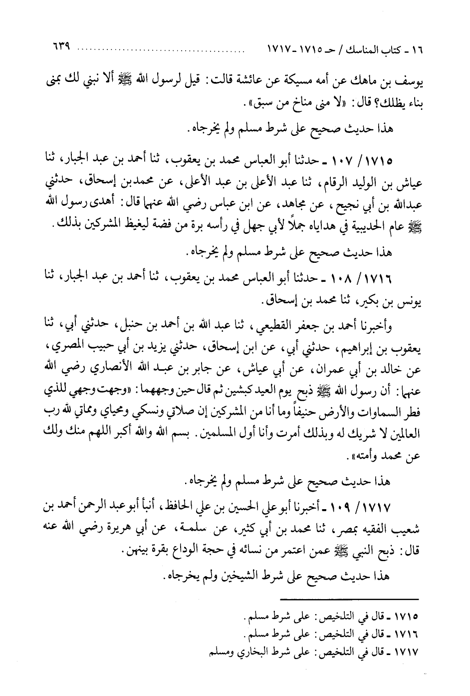 1716 - حَدَّثَنَا أَبُو الْعَبَّاسِ مُحَمَّدُ بْنُ يَعْقُوبَ، ثنا أَحْمَدُ بْنُ عَبْدِ الْجَبَّارِ، ثنا يُونُسُ بْنُ بُكَيْرٍ، ثنا مُحَمَّدُ بْنُ إِسْحَاقَ، وَأَخْبَرَنَا أَحْمَدُ بْنُ جَعْفَرٍ الْقَطِيعِيُّ، ثنا عَبْدُ اللَّهِ بْنُ أَحْمَدَ بْنِ حَنْبَلٍ، حَدَّثَنِي أَبِي، ثنا يَعْقُوبُ بْنُ إِبْرَاهِيمَ، حَدَّثَنِي أَبِي، عَنِ ابْنِ إِسْحَاقَ، حَدَّثَنِي يَزِيدُ بْنُ أَبِي حَبِيبٍ الْمِصْرِيُّ، عَنْ خَالِدِ بْنِ أَبِي عِمْرَانَ، عَنْ أَبِي عَيَّاشٍ، عَنْ جَابِرِ بْنِ عَبْدِ اللَّهِ الْأَنْصَارِيِّ رَضِيَ اللَّهُ عَنْهُمَا، أَنَّ رَسُولَ اللَّهِ صَلَّى اللهُ عَلَيْهِ وَسَلَّمَ ذَبَحَ يَوْمَ الْعِيدِ كَبْشَيْنِ، ثُمَّ قَالَ حِينَ وَجَّهَهُمَا: §«وَجَّهْتُ وَجْهِيَ لِلَّذِي فَطَرَ السَّمَاوَاتِ وَالْأَرْضَ حَنِيفًا وَمَا أَنَا مِنَ الْمُشْرِكِينَ، إِنَّ صَلَاتِي وَنُسُكِي وَمَحْيَايَ وَمَمَاتِي لِلَّهِ رَبِّ الْعَالَمِينَ لَا شَرِيكَ لَهُ، وَبِذَلِكَ أُمِرْتُ وَأَنَا أَوَّلُ الْمُسْلِمِينَ، بِسْمِ اللَّهِ وَاللَّهُ أَكْبَرُ، اللَّهُمَّ مِنْكَ وَلَكَ عَنْ مُحَمَّدٍ وَأُمَّتِهِ» هَذَا حَدِيثٌ صَحِيحٌ عَلَى شَرْطِ مُسْلِمٍ، وَلَمْ يُخَرِّجَاهُ "