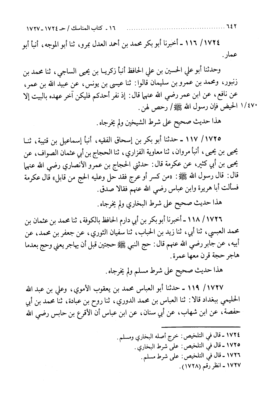 1724 - أَخْبَرَنَا أَبُو بَكْرٍ مُحَمَّدُ بْنُ أَحْمَدَ الْعَدْلُ بِمَرْوَ، ثنا أَبُو الْمُوَجِّهِ، أَنْبَأَ أَبُو عَمَّارٍ، وَحَدَّثَنَا أَبُو عَلِيٍّ الْحُسَيْنُ بْنُ عَلِيٍّ الْحَافِظُ، أَنْبَأَ زَكَرِيَّا بْنُ يَحْيَى السَّاجِيُّ، ثنا مُحَمَّدُ بْنُ زُنْبُورٍ، وَمُحَمَّدُ بْنُ عَمْرِو بْنِ سُلَيْمَانَ، قَالُوا: ثنا عِيسَى بْنُ يُونُسَ، عَنْ عُبَيْدِ اللَّهِ بْنِ عُمَرَ، عَنْ نَافِعٍ، عَنِ ابْنِ عُمَرَ رَضِيَ اللَّهُ عَنْهُمَا، قَالَ: «§إِذَا نَفَرَ أَحَدُكُمْ فَلْيَكُنْ آخِرُ عَهْدِهِ بِالْبَيْتِ إِلَّا الْحُيَّضُ، فَإِنَّ رَسُولَ اللَّهِ صَلَّى اللهُ عَلَيْهِ وَسَلَّمَ رَخَّصَ لَهُنَّ» هَذَا حَدِيثٌ صَحِيحٌ عَلَى شَرْطِ الشَّيْخَيْنِ، وَلَمْ يُخَرِّجَاهُ "