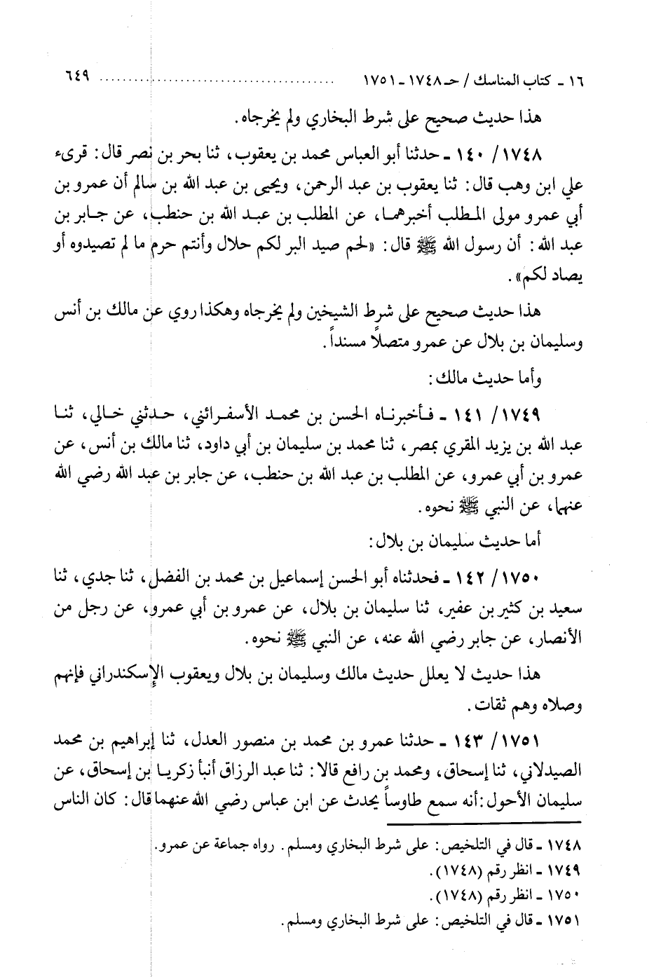 1748 - حَدَّثَنَا أَبُو الْعَبَّاسِ مُحَمَّدُ بْنُ يَعْقُوبَ، ثنا بَحْرُ بْنُ نَصْرٍ، قَالَ: قُرِئَ عَلَى ابْنِ وَهْبٍ، قَالَ: ثنا يَعْقُوبُ بْنُ عَبْدِ الرَّحْمَنِ، وَيَحْيَى بْنُ عَبْدِ اللَّهِ بْنِ سَالِمٍ، أَنَّ عَمْرَو بْنَ أَبِي عَمْرٍو مَوْلَى الْمُطَّلِبِ أَخْبَرَهُمَا، عَنِ الْمُطَّلِبِ بْنِ عَبْدِ اللَّهِ بْنِ حَنْطَبٍ، عَنْ جَابِرِ بْنِ عَبْدِ اللَّهِ، أَنَّ رَسُولَ اللَّهِ صَلَّى اللهُ عَلَيْهِ وَسَلَّمَ قَالَ: §«لَحْمُ صَيْدِ الْبَرِّ لَكُمْ حَلَالٌ وَأَنْتُمْ حُرُمٌ مَا لَمْ تَصِيدُوهُ أَوْ يُصَدْ لَكُمْ» هَذَا حَدِيثٌ صَحِيحٌ عَلَى شَرْطِ الشَّيْخَيْنِ، وَلَمْ يُخَرِّجَاهُ «وَهَكَذَا رُوِيَ عَنْ مَالِكِ بْنِ أَنَسٍ وَسُلَيْمَانَ بْنِ بِلَالٍ، عَنْ عَمْرٍو مُتَّصِلًا مُسْنَدًا، وَأَمَّا حَدِيثُ مَالِكٍ