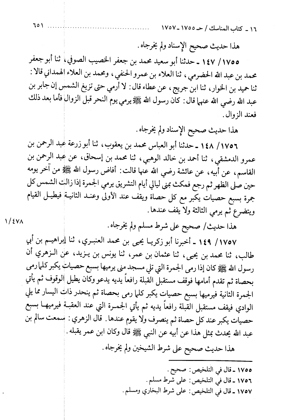 1757 - أَخْبَرَنَا أَبُو زَكَرِيَّا يَحْيَى بْنُ مُحَمَّدٍ الْعَنْبَرِيُّ، ثنا إِبْرَاهِيمُ بْنُ أَبِي طَالِبٍ، ثنا مُحَمَّدُ بْنُ يَحْيَى، ثنا عُثْمَانُ بْنُ عُمَرَ، ثنا يُونُسُ بْنُ يَزِيدَ، عَنِ الزُّهْرِيِّ، «أَنَّ رَسُولَ اللَّهِ صَلَّى اللهُ عَلَيْهِ وَسَلَّمَ كَانَ §إِذَا رَمَى الْجَمْرَةَ الَّتِي تَلِي مَسْجِدَ مِنًى يَرْمِيهَا بِسَبْعِ حَصَيَاتٍ، يُكَبِّرُ كُلَّمَا رَمَى بِحَصَاةٍ، ثُمَّ تَقَدَّمَ أَمَامَهَا، فَوَقَفَ مُسْتَقْبِلَ الْقِبْلَةِ رَافِعًا يَدَيْهِ يَدْعُو، وَكَانَ يُطِيلُ الْوُقُوفَ، ثُمَّ يَأْتِي الْجَمْرَةَ الثَّانِيَةَ فَيَرْمِيهَا بِسَبْعِ حَصَيَاتٍ يُكَبِّرُ، كُلَّمَا رَمَى بِحَصَاةٍ، ثُمَّ يَنْحَدِرُ ذَاتَ الْيَسَارِ مِمَّا يَلِي الْوَادِيَ فَيَقِفُ مُسْتَقْبِلَ الْقِبْلَةِ رَافِعًا يَدَيْهِ، ثُمَّ يَأْتِي الْجَمْرَةَ الَّتِي عِنْدَ الْعَقَبَةِ فَيَرْمِيهَا بِسَبْعِ حَصَيَاتٍ يُكَبِّرُ عِنْدَ كُلِّ حَصَاةٍ، ثُمَّ يَنْصَرِفُ وَلَا يَقُومُ عِنْدَهَا» قَالَ الزُّهْرِيُّ: سَمِعْتُ سَالِمَ بْنَ عَبْدِ اللَّهِ يُحَدِّثُ بِمِثْلِ هَذَا، عَنْ أَبِيهِ، عَنِ النَّبِيِّ صَلَّى اللهُ عَلَيْهِ وَسَلَّمَ قَالَ: وَكَانَ ابْنُ عُمَرَ يَقْبَلُهُ، هَذَا حَدِيثٌ صَحِيحٌ عَلَى شَرْطِ الشَّيْخَيْنِ، وَلَمْ يُخَرِّجَاهُ "