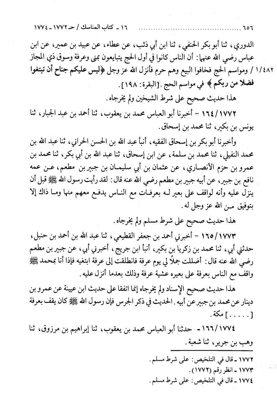 1773 - أَخْبَرَنِي أَحْمَدُ بْنُ جَعْفَرٍ الْقَطِيعِيُّ، ثنا عَبْدُ اللَّهِ بْنُ أَحْمَدَ بْنِ حَنْبَلٍ، حَدَّثَنِي أَبِي، ثنا مُحَمَّدُ بْنُ زَكَرِيَّا بْنِ بُكَيْرٍ، أَنْبَأَ ابْنُ جَرِيحٍ، أَخْبَرَنِي أَبِي، عَنْ جُبَيْرِ بْنِ مُطْعِمٍ رَضِيَ اللَّهُ عَنْهُ، قَالَ: أَضْلَلْتُ جَمَلًا لِي يَوْمَ عَرَفَةَ فَانْطَلَقْتُ إِلَى عَرَفَةَ أَبْتَغِيهِ «فَإِذَا أَنَا بِمُحَمَّدٍ صَلَّى اللهُ عَلَيْهِ وَسَلَّمَ §وَاقِفٌ مَعَ النَّاسِ بِعَرَفَةَ عَلَى بَعِيرِهِ عَشِيَّةَ عَرَفَةَ، وَذَلِكَ بَعْدَمَا أُنْزِلَ عَلَيْهِ» هَذَا حَدِيثٌ صَحِيحُ الْإِسْنَادِ، وَلَمْ يُخَرِّجَاهُ، إِنَّمَا اتَّفَقَا عَلَى حَدِيثِ ابْنِ عُيَيْنَةَ، عَنْ عَمْرِو بْنِ دِينَارٍ، عَنْ مُحَمَّدِ بْنِ جُبَيْرٍ، عَنْ أَبِيهِ الْحَدِيثَ فِي ذِكْرِ الْحُمْسِ، فَإِنَّ رَسُولَ اللَّهِ صَلَّى اللهُ عَلَيْهِ وَسَلَّمَ كَانَ يَقِفُ بِعَرَفَةَ. . . مَكَّةَ "