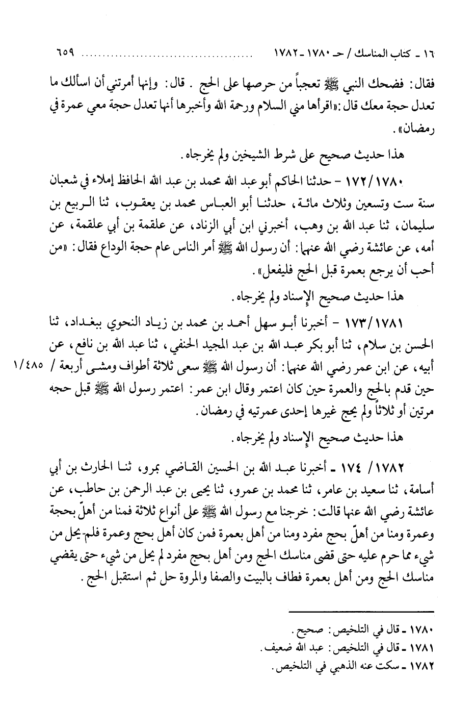 1780 - حَدَّثَنَا الْحَاكِمُ أَبُو عَبْدِ اللَّهِ مُحَمَّدُ بْنِ عَبْدِ اللَّهِ الْحَافِظُ إِمْلَاءً فِي شَعْبَانَ سَنَةَ سِتٍّ وَتِسْعِينَ وَثَلَاثِ مَائَةٍ، حَدَّثَنَا أَبُو الْعَبَّاسِ مُحَمَّدُ بْنُ يَعْقُوبَ، ثنا الرَّبِيعُ بْنُ سُلَيْمَانَ، ثنا عَبْدُ اللَّهِ بْنُ وَهْبٍ، أَخْبَرَنِي ابْنُ أَبِي الزِّنَادِ، عَنْ عَلْقَمَةَ بْنِ أَبِي عَلْقَمَةَ، عَنْ أُمِّهِ، عَنْ عَائِشَةَ رَضِيَ اللَّهُ عَنْهُمَا، أَنَّ رَسُولَ اللَّهِ صَلَّى اللهُ عَلَيْهِ وَسَلَّمَ أَمَرَ النَّاسَ عَامَ حَجَّةِ الْوَدَاعِ، فَقَالَ: §«مَنْ أَحَبَّ أَنْ يَرْجِعَ بِعُمْرَةٍ قَبْلَ الْحَجِّ فَلْيَفْعَلْ» هَذَا حَدِيثٌ صَحِيحُ الْإِسْنَادِ، وَلَمْ يُخَرِّجَاهُ "