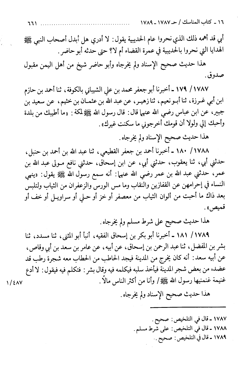 1788 - أَخْبَرَنَا أَحْمَدُ بْنُ جَعْفَرٍ الْقَطِيعِيُّ، ثنا عَبْدُ اللَّهِ بْنُ أَحْمَدَ بْنِ حَنْبَلٍ، حَدَّثَنِي أَبِي، ثنا يَعْقُوبُ، حَدَّثَنِي أَبِي، عَنِ ابْنِ إِسْحَاقَ، حَدَّثَنِي نَافِعٌ مَوْلَى عَبْدِ اللَّهِ بْنِ عُمَرَ، حَدَّثَنِي عَبْدُ اللَّهِ بْنُ عُمَرَ رَضِيَ اللَّهُ عَنْهُمَا، أَنَّهُ سَمِعَ رَسُولَ اللَّهِ صَلَّى اللهُ عَلَيْهِ وَسَلَّمَ يَقُولُ: «§يَنْهَى النِّسَاءَ فِي إِحْرَامِهِنَّ عَنِ الْقُفَّازَيْنِ، وَالنِّقَابِ، وَمَا مَسَّ الْوَرْسُ، وَالزَّعْفَرَانُ مِنَ الثِّيَابِ، وَلْتَلْبَسْ بَعْدَ ذَاكَ مَا أَحَبَّتْ مِنْ أَلْوَانِ الثِّيَابِ مِنْ مُعَصْفَرٍ، أَوْ خَزٍّ، أَوْ حُلِيٍّ، أَوْ سَرَاوِيلَ، أَوْ خُفٍّ، أَوْ قَمِيصٍ» هَذَا حَدِيثٌ صَحِيحٌ عَلَى شَرْطِ مُسْلِمٍ، وَلَمْ يُخَرِّجَاهُ "