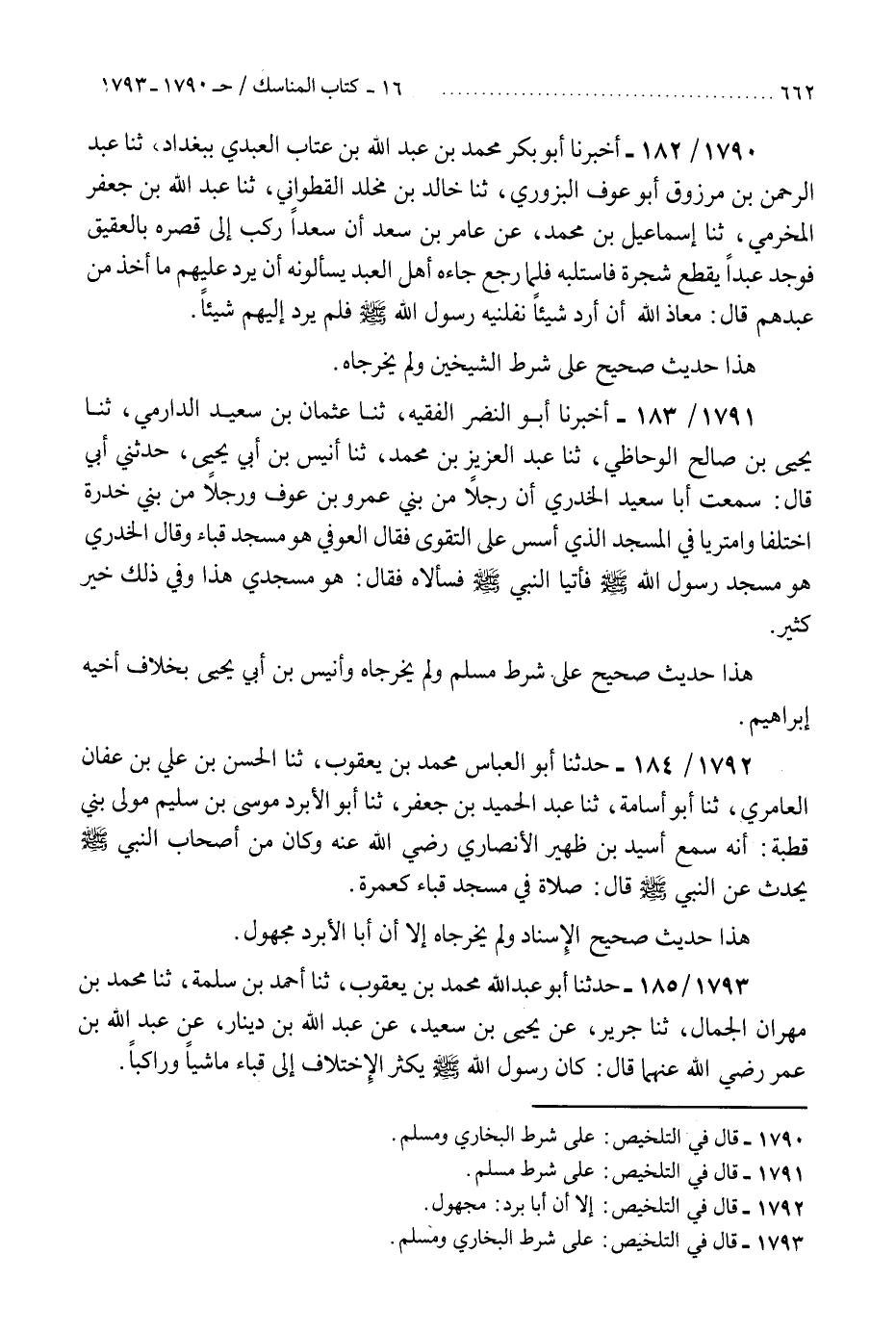 1793 - حَدَّثَنَا أَبُو عَبْدِ اللَّهِ مُحَمَّدُ بْنُ يَعْقُوبَ، ثنا أَحْمَدُ بْنُ سَلَمَةَ، ثنا مُحَمَّدُ بْنُ مِهْرَانَ الْجَمَّالُ، ثنا جَرِيرٌ، عَنْ يَحْيَى بْنِ سَعِيدٍ، عَنْ عَبْدِ اللَّهِ بْنِ دِينَارٍ، عَنْ عَبْدِ اللَّهِ بْنِ عُمَرَ، رَضِيَ اللَّهُ عَنْهُمَا، قَالَ: «كَانَ رَسُولُ اللَّهِ صَلَّى اللهُ عَلَيْهِ وَسَلَّمَ §يُكْثِرُ الِاخْتِلَافَ إِلَى قُبَاءَ مَاشِيًا وَرَاكِبًا» هَذَا حَدِيثٌ صَحِيحٌ عَلَى شَرْطِ الْبُخَارِيِّ، وَلَمْ يُخَرِّجَاهُ بِهَذَا اللَّفْظِ "