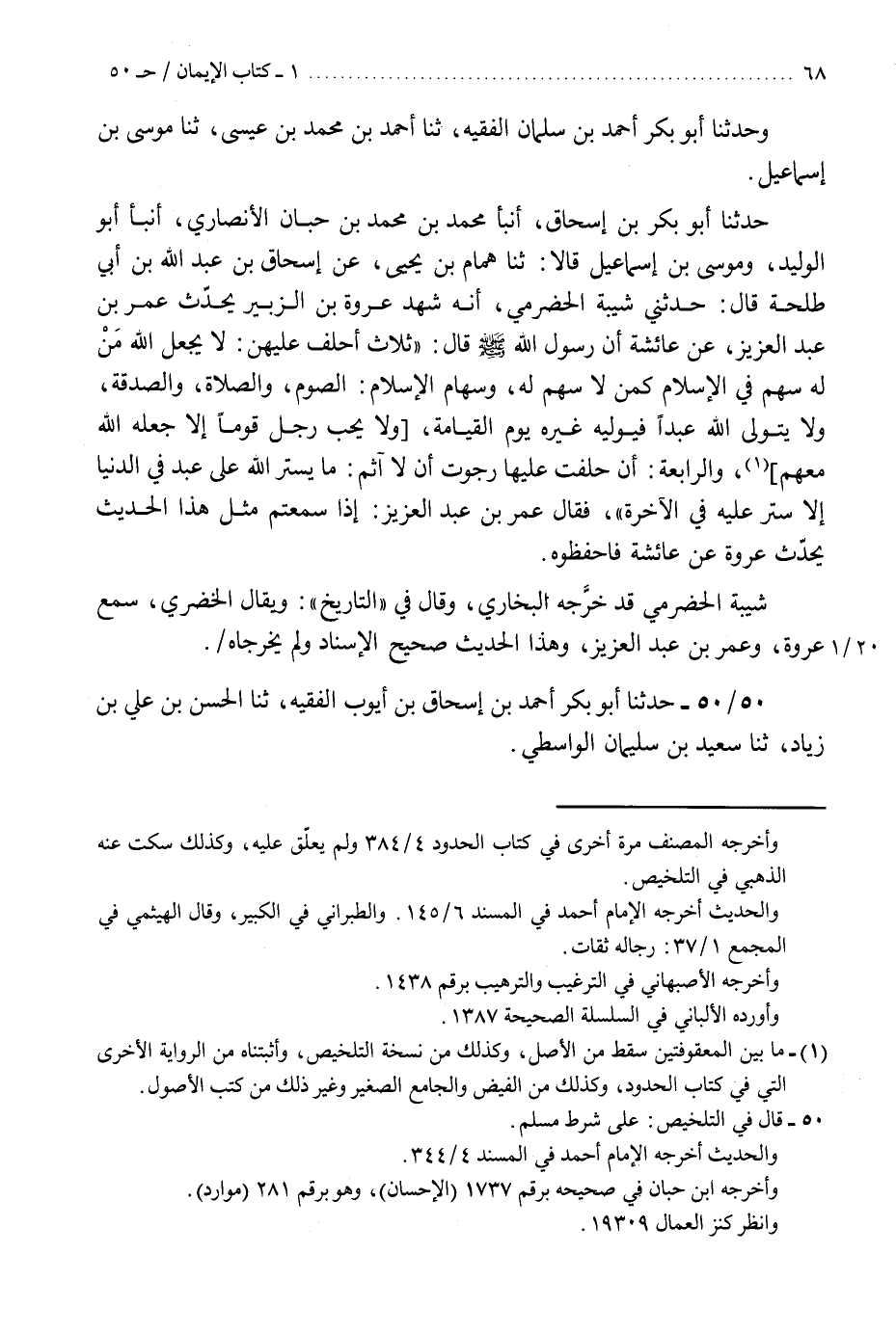 50 - حَدَّثَنَا أَبُو بَكْرٍ أَحْمَدُ بْنُ إِسْحَاقَ بْنِ أَيُّوبَ الْفَقِيهُ، ثنا الْحَسَنُ بْنُ عَلِيِّ بْنِ زِيَادٍ، ثنا سَعِيدُ بْنُ سُلَيْمَانَ الْوَاسِطِيُّ، وَحَدَّثَنَا أَبُو الْعَبَّاسِ مُحَمَّدُ بْنُ يَعْقُوبَ، ثنا الْعَبَّاسُ بْنُ مُحَمَّدٍ الدُّورِيُّ، ثنا يَحْيَى بْنُ مَعِينٍ، وَحَدَّثَنَا عَلِيُّ بْنُ عِيسَى، ثنا أَحْمَدُ بْنُ نَجْدَةَ، ثنا سَعِيدُ بْنُ مَنْصُورٍ، قَالُوا: ثنا هُشَيْمٌ، عَنْ دَاوُدَ بْنِ أَبِي هِنْدٍ، عَنْ أَبِي حَرْبِ بْنِ أَبِي الْأَسْوَدِ، عَنْ فَضَالَةَ اللَّيْثِيِّ، قَالَ: أَتَيْتُ النَّبِيَّ صَلَّى اللهُ عَلَيْهِ وَسَلَّمَ فَقُلْتُ: إِنِّي أُرِيدُ الْإِسْلَامَ فَعَلِّمْنِي شَرَائِعَ مِنْ شَرَائِعِ الْإِسْلَامِ، فَذَكَرَ الصَّلَاةَ وَشَهْرَ رَمَضَانَ وَمَوَاقِيتَ الصَّلَاةِ، فَقُلْتُ: يَا رَسُولَ اللَّهِ إِنَّكَ تَذْكُرُ سَاعَاتٍ أَنَا فِيهِنَّ مَشْغُولٌ، وَلَكِنْ عَلِّمْنِي جِمَاعًا مِنَ الْكَلَامِ، قَالَ: «§إِنْ شُغِلْتَ فَلَا تُشْغَلْ عَنِ الْعَصْرَيْنِ» قُلْتُ: وَمَا الْعَصْرَانِ؟ وَلَمْ تَكُنْ لُغَةَ قَوْمِي، قَالَ: «الْفَجْرُ وَالْعَصْرُ» . «هَذَا حَدِيثٌ صَحِيحٌ عَلَى شَرْطِ مُسْلِمٍ، وَلَمْ يُخَرِّجَاهُ، وَفِيهِ أَلْفَاظٌ لَمْ يُخَرِّجَاهَا بِإِسْنَادٍ آخَرَ، وَأَكْثَرُهَا فَائِدَةً ذِكْرُ شَرَائِعِ الْإِسْلَامِ، فَإِنَّهُ فِي حَدِيثِ عَبْدِ الْعَزِيزِ بْنِ أَبِي دَاوُدَ، عَنْ عَلْقَمَةَ بْنِ مَرْثَدٍ، عَنْ يَحْيَى بْنِ يَعْمَرَ، عَنِ ابْنِ عُمَرَ، وَلَيْسَ مِنْ شَرْطِ وَاحِدٍ مِنْهُمَا، وَقَدْ خُولِفَ هُشَيْمُ بْنُ بَشِيرٍ فِي هَذَا الْإِسْنَادِ، عَنْ دَاوُدَ بْنِ أَبِي هِنْدٍ خِلَافًا لَا يَضُرُّ الْحَدِيثَ بَلْ يَزِيدُهُ تَأْكِيدًا» K50 - على شرط مسلم