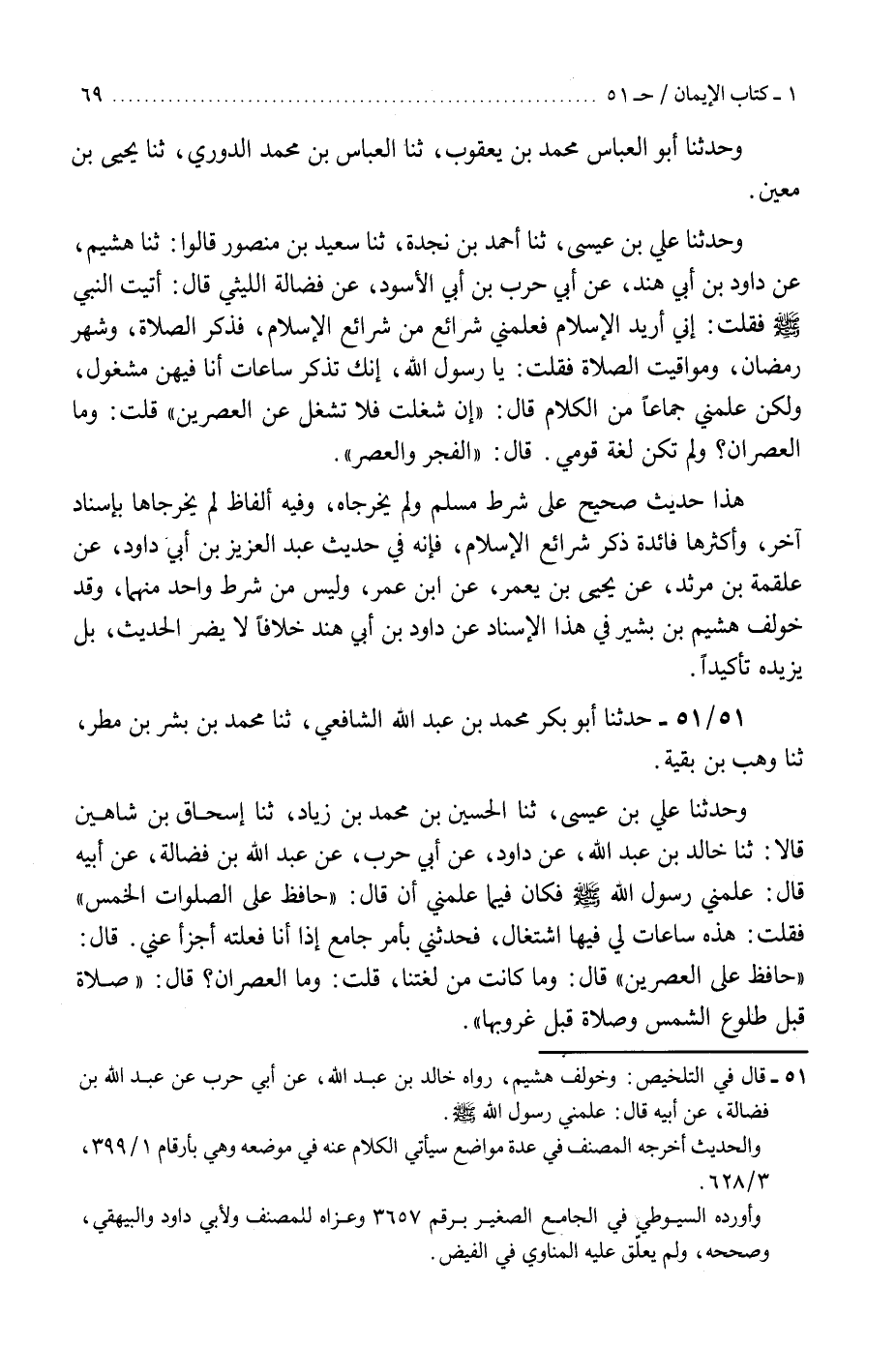 51 - حَدَّثَنَا أَبُو بَكْرٍ مُحَمَّدُ بْنُ عَبْدِ اللَّهِ الشَّافِعِيُّ، ثنا مُحَمَّدُ بْنُ بِشْرِ بْنِ مَطَرٍ، ثنا وَهْبُ بْنُ بَقِيَّةَ، وَحَدَّثَنَا عَلِيُّ بْنُ عِيسَى، ثنا الْحُسَيْنُ بْنُ مُحَمَّدِ بْنِ زِيَادٍ، ثنا إِسْحَاقُ بْنُ شَاهِينَ، قَالَا: ثنا خَالِدُ بْنُ عَبْدِ اللَّهِ، عَنْ دَاوُدَ، عَنْ أَبِي حَرْبٍ، عَنْ عَبْدِ اللَّهِ بْنِ فَضَالَةَ، عَنْ أَبِيهِ، قَالَ: عَلَّمَنِي رَسُولُ اللَّهِ صَلَّى اللهُ عَلَيْهِ وَسَلَّمَ فَكَانَ فِيمَا عَلَّمَنِي أَنْ قَالَ: «حَافِظْ عَلَى الصَّلَوَاتِ الْخَمْسِ» فَقُلْتُ: هَذِهِ سَاعَاتٌ لِي فِيهَا اشْتِغَالٌ، فَحَدِّثْنِي بِأَمْرٍ جَامِعٍ إِذَا أَنَا فَعَلْتُهُ أَجْزَأَ عَنِّي، قَالَ: «§حَافِظْ عَلَى الْعَصْرَيْنِ» قَالَ: وَمَا كَانَتْ مِنْ لُغَتِنَا قُلْتُ: وَمَا الْعَصْرَانِ؟ قَالَ: «صَلَاةٌ قَبْلَ طُلُوعِ الشَّمْسِ، وَصَلَاةٌ قَبْلَ غُرُوبِهَا» . «وَأَبُو حَرْبِ بْنِ أَبِي الْأَسْوَدِ الدِّيلِيُّ تَابِعِيٌّ كَبِيرٌ عِنْدَهُ مِنْ أَكَابِرِ الصَّحَابَةِ لَا يُقْصَرُ سَمَاعُهُ عَنْ فَضَالَةَ بْنِ عُبَيْدٍ اللَّيْثِيِّ فَإِنَّ هُشَيْمَ بْنَ بَشِيرٍ حَافِظٌ مَعْرُوفٌ بِالْحِفْظِ، وَخَالِدُ بْنُ عَبْدِ اللَّهِ الْوَاسِطِيُّ صَاحِبُ كِتَابٍ، وَهَذَا فِي الْجُمْلَةِ كَمَا خَرَّجَ مُسْلِمٌ فِي كِتَابِ الْإِيمَانِ حَدِيثَ شُعْبَةَ، عَنْ عُثْمَانَ بْنِ عَبْدِ اللَّهِ بْنِ مَوْهَبٍ، وَبَعْدَهُ عَنْ مُحَمَّدِ بْنِ عُثْمَانَ، عَنْ أَبِيهِ» K51 - وخولف هشيم رواه خالد بن عبد الله عن أبي حرب عن عبد الله بن فضالة عن أبيه قال علمني رسول الله صلى الله عليه وسلم