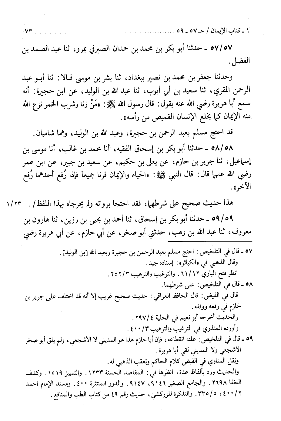 57 - حَدَّثَنَا أَبُو بَكْرِ بْنُ مُحَمَّدِ بْنِ حَمْدَانَ الصَّيْرَفِيُّ، بِمَرْوَ، ثنا عَبْدُ الصَّمَدِ بْنُ الْفَضْلِ، وَحَدَّثَنَا جَعْفَرُ بْنُ مُحَمَّدِ بْنِ نُصَيْرٍ، بِبَغْدَادَ، ثنا بِشْرُ بْنُ مُوسَى، قَالَا: ثنا أَبُو عَبْدِ الرَّحْمَنِ الْمُقْرِئُ، ثنا سَعِيدُ بْنُ أَبِي أَيُّوبَ، ثنا عَبْدُ اللَّهِ بْنُ الْوَلِيدِ، عَنِ ابْنِ حُجَيْرَةَ، أَنَّهُ سَمِعَ أَبَا هُرَيْرَةَ رَضِيَ اللَّهُ عَنْهُ، يَقُولُ: قَالَ رَسُولُ اللَّهِ صَلَّى اللهُ عَلَيْهِ وَسَلَّمَ: §«مَنْ زَنَى وَشَرِبَ الْخَمْرَ نَزَعَ اللَّهُ مِنْهُ الْإِيمَانَ كَمَا يَخْلَعُ الْإِنْسَانُ الْقَمِيصَ مِنْ رَأْسِهِ» . " قَدِ احْتَجَّ مُسْلِمٌ بِعَبْدِ الرَّحْمَنِ بْنِ حُجَيْرَةَ وَعَبْدِ اللَّهِ بْنِ الْوَلِيدِ وَهُمَا شَامِيَّانِK57 - احتج مسلم بعبد الرحمن بن حجيرة وبعبد الله بن الوليد