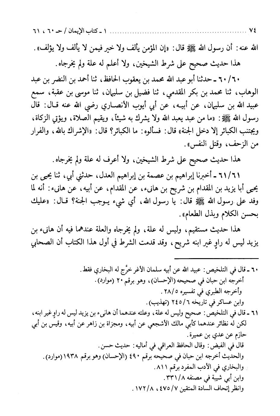 61 - أَخْبَرَنَا إِبْرَاهِيمُ بْنُ عِصْمَةَ بْنِ إِبْرَاهِيمَ الْعَدْلُ، حَدَّثَنِي أَبِي، ثنا يَحْيَى بْنُ يَحْيَى، أَنَا يَزِيدُ بْنُ الْمِقْدَامِ بْنِ شُرَيْحِ بْنِ هَانِئٍ، عَنِ الْمِقْدَامِ، عَنْ أَبِيهِ، عَنْ هَانِئٍ، أَنَّهُ لَمَّا وَفَدَ عَلَى رَسُولِ اللَّهِ صَلَّى اللهُ عَلَيْهِ وَسَلَّمَ، قَالَ: يَا رَسُولَ اللَّهِ، أَيُّ شَيْءٍ يُوجِبُ الْجَنَّةَ؟ قَالَ: «§عَلَيْكَ بِحُسْنِ الْكَلَامِ، وَبَذْلِ الطَّعَامِ» . «هَذَا حَدِيثٌ مُسْتَقِيمٌ وَلَيْسَ لَهُ عِلَّةٌ وَلَمْ يُخَرِّجَاهُ، وَالْعِلَّةُ عِنْدَهُمَا فِيهِ أَنَّ هَانِئَ بْنَ يَزِيدَ لَيْسَ لَهُ رَاوٍ غَيْرُ ابْنِهِ شُرَيْحٍ، وَقَدْ قَدَّمْتُ الشَّرْطَ فِي أَوَّلِ هَذَا الْكِتَابِ أَنَّ الصَّحَابِيَّ الْمَعْرُوفَ إِذَا لَمْ نَجِدْ لَهُ رَاوِيًا غَيْرَ تَابِعِيٍّ وَاحِدٍ مَعْرُوفٍ احْتَجَجْنَا بِهِ، وَصَحَّحْنَا حَدِيثَهُ إِذْ هُوَ صَحِيحٌ عَلَى شَرْطِهِمَا جَمِيعًا، فَإِنَّ الْبُخَارِيَّ قَدِ احْتَجَّ بِحَدِيثِ قَيْسِ بْنِ أَبِي حَازِمٍ، عَنِ مِرْدَاسٍ الْأَسْلَمِيِّ، عَنِ النَّبِيِّ صَلَّى اللهُ عَلَيْهِ وَسَلَّمَ» يَذْهَبُ الصَّالِحُونَ «وَاحْتَجَّ بِحَدِيثِ قَيْسٍ، عَنْ عَدِيِّ بْنِ عَمِيرَةَ، عَنِ النَّبِيِّ صَلَّى اللهُ عَلَيْهِ وَسَلَّمَ» مَنِ اسْتَعْمَلْنَاهُ عَلَى عَمَلٍ «وَلَيْسَ لَهُمَا رَاوٍ غَيْرُ قَيْسِ بْنِ أَبِي حَازِمٍ، وَكَذَلِكَ مُسْلِمٌ قَدِ احْتَجَّ بِأَحَادِيثِ أَبِي مَالِكٍ الْأَشْجَعِيِّ، عَنْ أَبِيهِ وَأَحَادِيثِ مَجْزَأةَ بْنِ زَاهِرٍ الْأَسْلَمِيِّ، عَنْ أَبِيهِ فَلَزِمَهُمَا جَمِيعًا عَلَى شَرْطِهِمَا الِاحْتِجَاجُ بِحَدِيثِ شُرَيْحٍ، عَنْ أَبِيهِ، فَإِنَّ الْمِقْدَامَ وَأَبَاهُ شُرَيْحًا مِنْ أَكَابِرِ التَّابِعِينَ، وَقَدْ كَانَ هَانِئُ بْنُ يَزِيدَ وَفَدَ عَلَى رَسُولِ اللَّهِ صَلَّى اللهُ عَلَيْهِ وَسَلَّمَ» K61 - صحيح وليس له علة