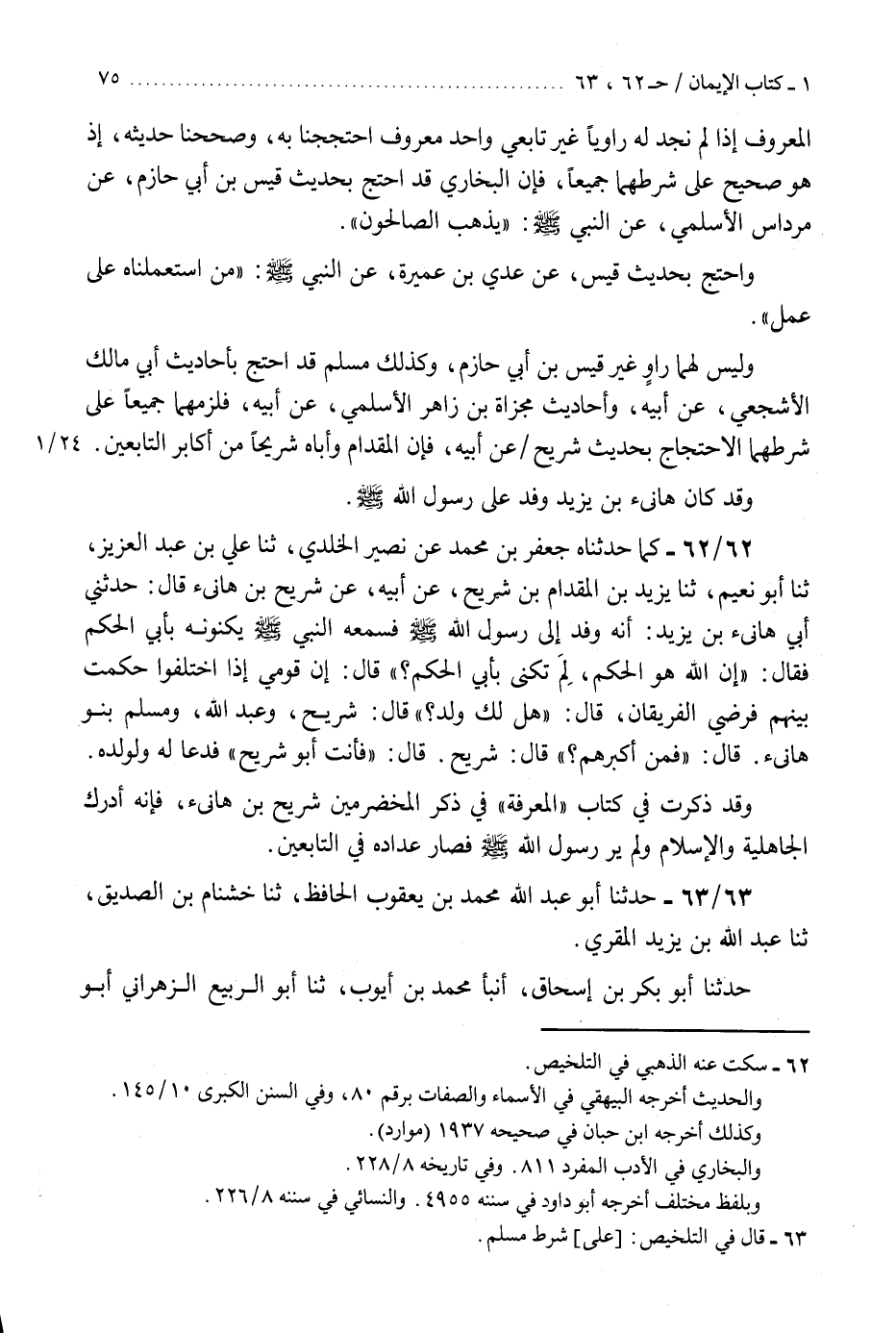 62 - كَمَا حَدَّثَنَاهُ جَعْفَرُ بْنُ مُحَمَّدِ بْنِ نُصَيْرٍ الْخُلْدِيِّ، ثنا عَلِيُّ بْنُ عَبْدِ الْعَزِيزِ، ثنا أَبُو نُعَيْمٍ، ثنا يَزِيدُ بْنُ الْمِقْدَامِ بْنِ شُرَيْحٍ، عَنْ أَبِيهِ، عَنْ شُرَيْحِ بْنِ هَانِئٍ، قَالَ: حَدَّثَنِي أَبِي هَانِئِ بْنِ يَزِيدَ، أَنَّهُ وَفَدَ إِلَى رَسُولِ اللَّهِ صَلَّى اللهُ عَلَيْهِ وَسَلَّمَ فَسَمِعَهُ النَّبِيُّ صَلَّى اللهُ عَلَيْهِ وَسَلَّمَ يُكَنُّونَهُ بِأَبِي الْحَكَمِ، فَقَالَ: «إِنَّ §اللَّهَ هُوَ الْحَكَمُ لِمَ تُكَنَّى بِأَبِي الْحَكَمِ؟» قَالَ: إِنَّ قَوْمِي إِذَا اخْتَلَفُوا حَكَمْتُ بَيْنَهُمْ فَرَضِيَ الْفَرِيقَانِ، قَالَ: «هَلْ لَكَ وَلَدٌ؟» ، قَالَ: شُرَيْحٌ وَعَبْدُ اللَّهِ وَمُسْلِمٌ بَنُو هَانِئٍ، قَالَ: «فَمَنْ أَكْبَرُهُمْ؟» قَالَ: شُرَيْحٌ، قَالَ: «فَأَنْتَ أَبُو شُرَيْحٍ فَدَعَا لَهُ وَلِوَلَدِهِ» . «وَقَدْ ذَكَرْتُ فِي كِتَابِ الْمَعْرِفَةِ فِي ذِكْرِ الْمُخَضْرَمِينَ شُرَيْحَ بْنَ هَانِئٍ فَإِنَّهُ أَدْرَكَ الْجَاهِلِيَّةَ وَالْإِسْلَامَ، وَلَمْ يَرَ رَسُولَ اللَّهِ صَلَّى اللهُ عَلَيْهِ وَسَلَّمَ فَصَارَ عِدَادُهُ فِي التَّابِعِينَ» K62 - سكت عنه الذهبي في التلخيص