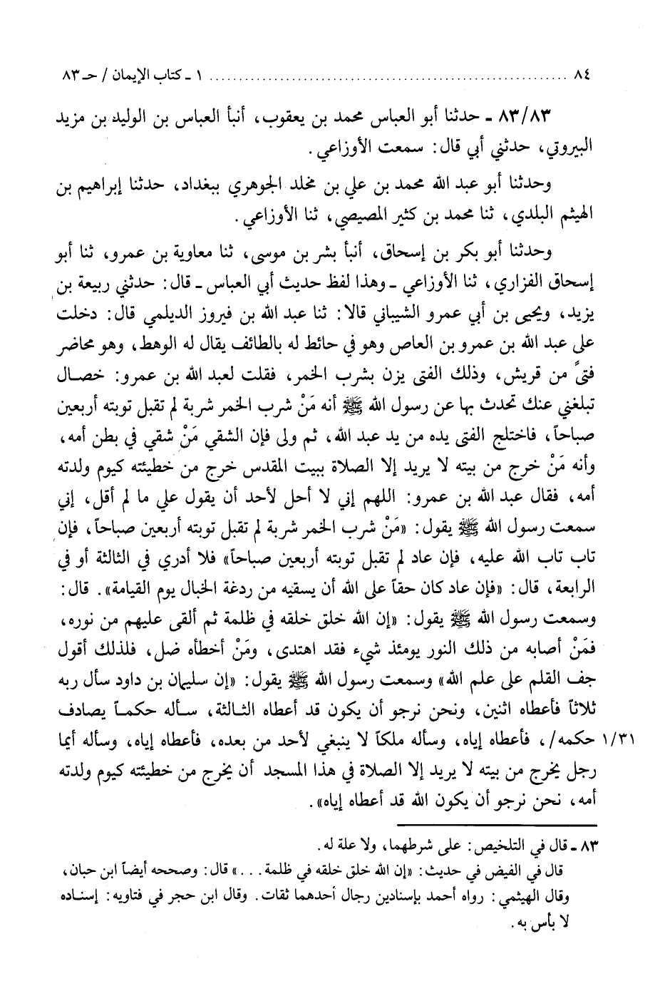 83 - حَدَّثَنَا أَبُو الْعَبَّاسِ مُحَمَّدُ بْنُ يَعْقُوبَ، أَنْبَأَ الْعَبَّاسُ بْنُ الْوَلِيدِ بْنِ مَزْيَدٍ الْبَيْرُوتِيُّ، حَدَّثَنِي أَبِي، قَالَ: سَمِعْتُ الْأَوْزَاعِيَّ، وَحَدَّثَنَا أَبُو عَبْدِ اللَّهِ مُحَمَّدُ بْنُ عَلِيِّ بْنِ مَخْلَدٍ الْجَوْهَرِيُّ بِبَغْدَادَ، حَدَّثَنَا إِبْرَاهِيمُ بْنُ الْهَيْثَمِ الْبَلَدِيُّ، ثنا مُحَمَّدُ بْنُ كَثِيرٍ الْمِصِّيصِيُّ، ثنا الْأَوْزَاعِيُّ، وَحدثنا أَبُو بَكْرِ بْنُ إِسْحَاقَ، أَنْبَأَ بِشْرُ بْنُ مُوسَى، ثنا مُعَاوِيَةُ بْنُ عَمْرٍو، ثنا أَبُو إِسْحَاقَ الْفَزَارِيُّ، ثنا الْأَوْزَاعِيُّ، وَهَذَا لَفْظُ حَدِيثِ أَبِي الْعَبَّاسِ، قَالَ: حَدَّثَنِي رَبِيعَةُ بْنُ يَزِيدَ، وَيَحْيَى بْنُ أَبِي عَمْرٍو السَّيْبَانِيُّ، قَالَا: ثنا عَبْدُ اللَّهِ بْنُ فَيْرُوزَ الدَّيْلَمِيُّ، قَالَ: دَخَلْتُ عَلَى عَبْدِ اللَّهِ بْنِ عَمْرِو بْنِ الْعَاصِ وَهُوَ فِي حَائِطٍ لَهُ بِالطَّائِفِ يُقَالُ لَهُ الْوَهْطُ، وَهُوَ مُحَاضِرٌ فَتًى مِنْ قُرَيْشٍ، وَذَلِكَ الْفَتَى يَزِنُّ بِشُرْبِ الْخَمْرِ، فَقُلْتُ لِعَبْدِ اللَّهِ بْنِ عَمْرٍو: خِصَالٌ تَبْلُغُنِي عَنْكَ تُحَدِّثُ بِهَا عَنْ رَسُولِ اللَّهِ صَلَّى اللهُ عَلَيْهِ وَسَلَّمَ: أَنَّهُ §مَنْ شَرِبَ الْخَمْرَ شَرْبَةً لَمْ تُقْبَلْ تَوْبَتُهُ أَرْبَعِينَ صَبَاحًا، فَاخْتَلَجَ الْفَتَى يَدَهُ مِنْ يَدِ عَبْدِ اللَّهِ، ثُمَّ وَلَّى، فَإِنَّ الشَّقِيَّ مَنْ شَقِيَ فِي بَطْنِ أُمِّهِ، وَأَنَّهُ مَنْ خَرَجَ مِنْ بَيْتِهِ لَا يُرِيدُ إِلَّا الصَّلَاةَ بِبَيْتِ الْمَقْدِسِ خَرَجَ مِنْ خَطِيئَتِهِ كَيَوْمِ وَلَدَتْهُ أُمُّهُ، فَقَالَ عَبْدُ اللَّهِ بْنُ عَمْرٍو: اللَّهُمَّ إِنِّي لَا أُحِلُّ لِأَحَدٍ أَنْ يَقُولَ عَلَيَّ مَا لَمْ أَقُلْ، إِنِّي سَمِعْتُ رَسُولَ اللَّهِ صَلَّى اللهُ عَلَيْهِ وَسَلَّمَ، يَقُولُ: «مَنْ شَرِبَ الْخَمْرَ شَرْبَةً لَمْ تُقْبَلْ تَوْبَتُهُ أَرْبَعِينَ صَبَاحًا، فَإِنْ تَابَ تَابَ اللَّهُ عَلَيْهِ، فَإِنْ عَادَ لَمْ تُقْبَلْ تَوْبَتُهُ أَرْبَعِينَ صَبَاحًا» فَلَا أَدْرِي فِي الثَّالِثَةِ أَوْ فِي الرَّابِعَةِ قَالَ: «فَإِنْ عَادَ كَانَ حَقًّا عَلَى اللَّهِ أَنْ يَسْقِيَهُ مِنْ رَدْغَةِ الْخَبَالِ يَوْمَ الْقِيَامَةِ» ، قَالَ: وَسَمِعْتُ رَسُولَ اللَّهِ صَلَّى اللهُ عَلَيْهِ وَسَلَّمَ، يَقُولُ: «إِنَّ اللَّهَ خَلَقَ خَلْقَهُ فِي ظُلْمَةٍ، ثُمَّ أَلْقَى عَلَيْهِمْ مِنْ نُورِهِ، فَمَنْ أَصَابَهُ مِنْ ذَلِكَ النُّورِ يَوْمَئِذٍ شَيْءٌ فَقَدِ اهْتَدَى، وَمَنْ أَخْطَأَهُ ضَلَّ فَلِذَلِكَ أَقُولُ جَفَّ الْقَلَمُ عَلَى عَلْمِ اللَّهِ» ، وَسَمِعْتُ رَسُولَ اللَّهِ صَلَّى اللهُ عَلَيْهِ وَسَلَّمَ، يَقُولُ: «إِنَّ سُلَيْمَانَ بْنَ دَاوُدَ سَأَلَ رَبَّهُ ثَلَاثًا فَأَعْطَاهُ اثْنَيْنِ، وَنَحْنُ نَرْجُو أَنْ يَكُونَ قَدْ أَعْطَاهُ الثَّالِثَةَ، سَأَلَهُ حُكْمًا يُصَادِفُ حُكْمَهُ فَأَعْطَاهُ إِيَّاهُ، وَسَأَلَهُ مُلْكًا لَا يَنْبَغِي لِأَحَدٍ بَعْدَهُ فَأَعْطَاهُ، إِيَّاهُ، وَسَأَلَهُ أَيُّمَا رَجُلٍ يَخْرُجُ مِنْ بَيْتِهِ لَا يُرِيدُ إِلَّا الصَّلَاةَ فِي هَذَا الْمَسْجِدِ أَنْ يَخْرُجَ مِنْ خَطِيئَتِهِ كَيَوْمِ وَلَدَتْهُ أُمُّهُ، نَحْنُ نَرْجُو أَنْ يَكُونَ اللَّهُ قَدْ أَعْطَاهُ إِيَّاهُ» . قَالَ الْأَوْزَاعِيُّ: حَدَّثَنِي رَبِيعَةُ بْنُ يَزِيدَ بِهَذَا الْحَدِيثِ فِيمَا بَيْنَ الْمِقْسِلَاطِ وَالْجَاصَعِيرِ. هَذَا حَدِيثٌ صَحِيحٌ قَدْ تَدَاوَلَهُ الْأَئِمَّةُ، وَقَدِ احْتَجَّا بِجَمِيعِ رُوَاتِهِ، ثُمَّ لَمْ يُخَرِّجَاهُ، وَلَا أَعْلَمُ لَهُ عِلَّةًK83 - على شرطهما ولا علة له