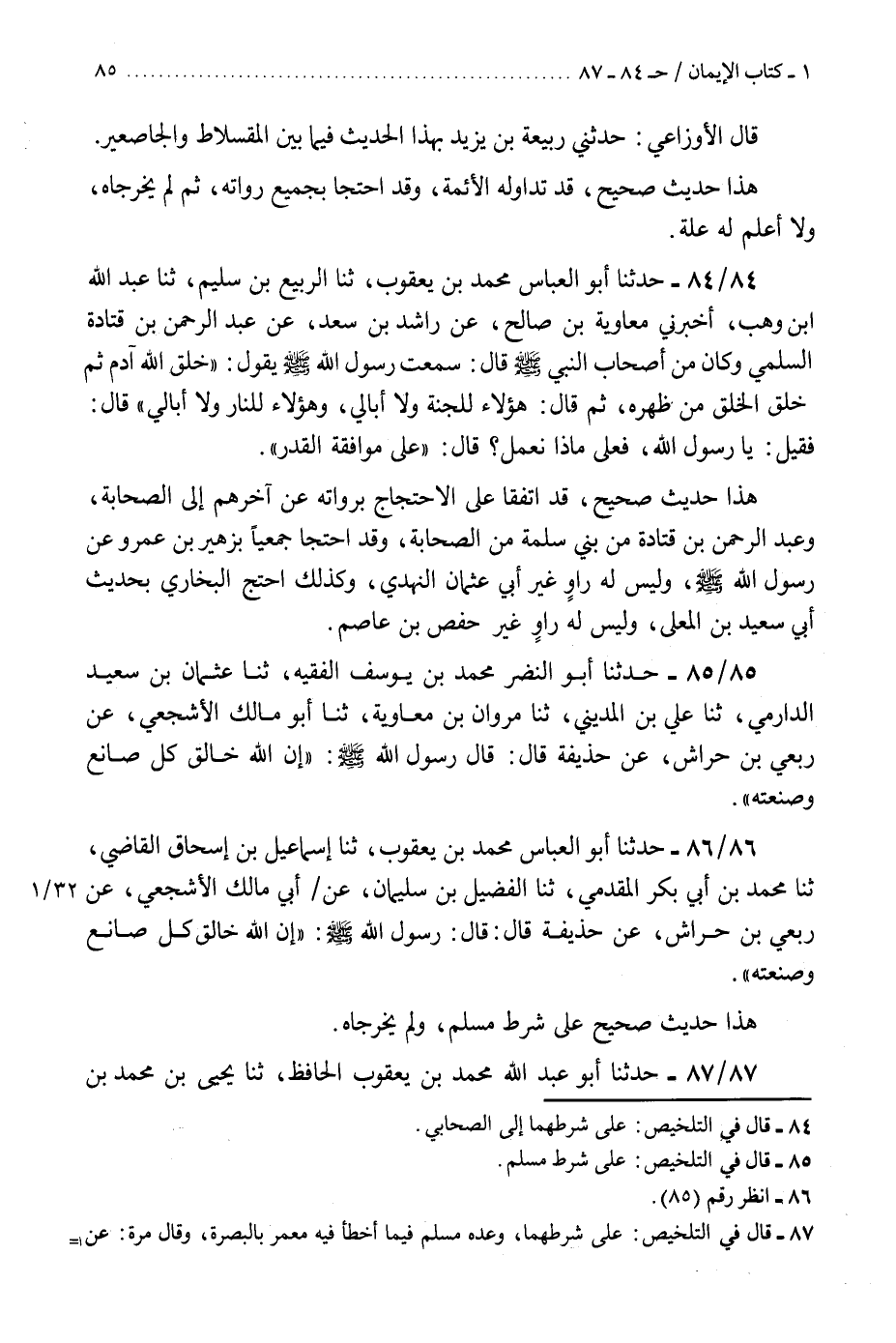 84 - حَدَّثَنَا أَبُو الْعَبَّاسِ مُحَمَّدُ بْنُ يَعْقُوبَ، ثنا الرَّبِيعُ بْنُ سُلَيْمٍ، ثنا عَبْدُ اللَّهِ بْنُ وَهْبٍ، أَخْبَرَنِي مُعَاوِيَةُ بْنُ صَالِحٍ، عَنْ رَاشِدِ بْنِ سَعْدٍ، عَنْ عَبْدِ الرَّحْمَنِ بْنِ قَتَادَةَ السُّلَمِيِّ، وَكَانَ مِنْ أَصْحَابِ النَّبِيِّ صَلَّى اللهُ عَلَيْهِ وَسَلَّمَ، قَالَ: سَمِعْتُ رَسُولَ اللَّهِ صَلَّى اللهُ عَلَيْهِ وَسَلَّمَ، يَقُولُ: " خَلَقَ اللَّهُ آدَمَ ثُمَّ خَلَقَ الْخَلْقَ مِنْ ظَهْرِهِ، ثُمَّ قَالَ: §هَؤُلَاءِ لِلْجَنَّةِ وَلَا أُبَالِي، وَهَؤُلَاءِ لِلنَّارِ وَلَا أُبَالِي " قَالَ: فَقِيلَ: يَا رَسُولَ اللَّهِ فَعَلَى مَاذَا نَعْمَلُ، قَالَ: عَلَى مُوَافَقَةِ الْقَدَرِ «.» هَذَا حَدِيثٌ صَحِيحٌ قَدِ اتَّفَقَا عَلَى الِاحْتِجَاجِ بِرُوَاتِهِ، عَنْ آخِرِهِمْ إِلَى الصَّحَابَةِ، وَعَبْدُ الرَّحْمَنِ بْنُ قَتَادَةَ مِنْ بَنِي سَلَمَةَ مِنَ الصَّحَابَةِ، وَقَدِ احْتَجَّا جَمِيعًا بِزُهَيْرِ بْنِ عَمْرٍو، عَنْ رَسُولِ اللَّهِ صَلَّى اللهُ عَلَيْهِ وَسَلَّمَ، وَلَيْسَ لَهُ رَاوٍ غَيْرُ أَبِي عُثْمَانَ النَّهْدِيِّ، وَكَذَلِكَ احْتَجَّ الْبُخَارِيُّ بِحَدِيثِ أَبِي سَعِيدِ بْنِ الْمُعَلَّى، وَلَيْسَ لَهُ رَاوٍ غَيْرُ حَفْصِ بْنِ عَاصِمٍ "K84 - على شرطهما إلى الصحابي