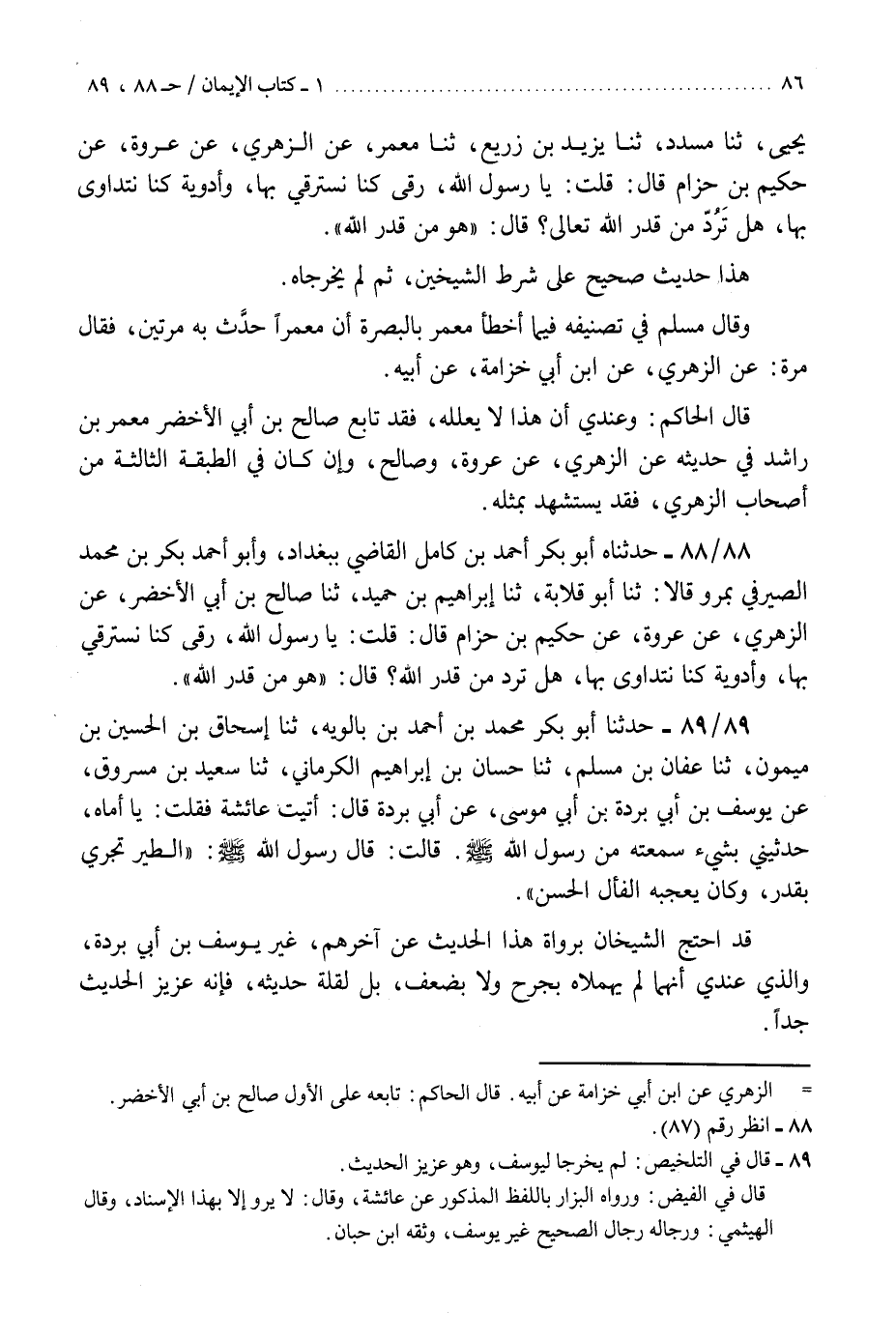 88 - حَدَّثَنَاهُ أَبُو بَكْرٍ أَحْمَدُ بْنُ كَامِلٍ الْقَاضِي، بِبَغْدَادَ، وَأَبُو أَحْمَدَ بَكْرُ بْنُ مُحَمَّدٍ الصَّيْرَفِيُّ، بِمَرْوَ، قَالَا: ثنا أَبُو قِلَابَةَ، ثنا إِبْرَاهِيمُ بْنُ حُمَيْدٍ، ثنا صَالِحُ بْنُ أَبِي الْأَخْضَرِ، عَنِ الزُّهْرِيِّ، عَنْ عُرْوَةَ، عَنْ حَكِيمِ بْنِ حِزَامٍ، قَالَ: قُلْتُ: يَا رَسُولَ اللَّهِ رُقًى كُنَّا نَسْتَرْقِي بِهَا وَأَدْوِيَةٌ كُنَّا نَتَدَاوَى بِهَا هَلْ تَرُدُّ مِنْ قَدَرِ اللَّهِ، قَالَ: §«هُوَ مِنْ قَدَرِ اللَّهِ»