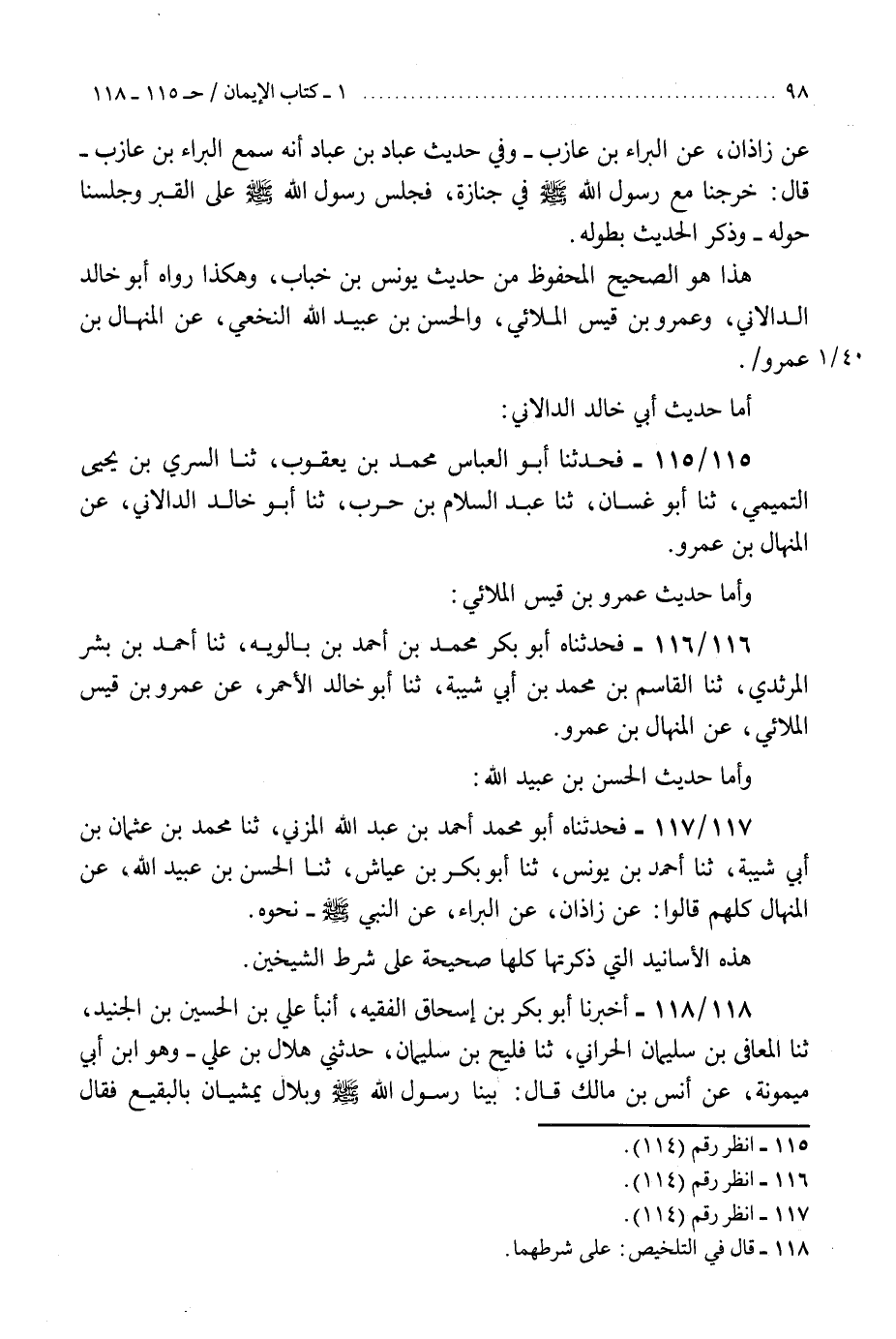 118 - أَخْبَرَنَا أَبُو بَكْرِ بْنُ إِسْحَاقَ الْفَقِيهُ، أَنْبَأَ عَلِيُّ بْنُ الْحُسَيْنِ بْنِ الْجُنَيْدِ، ثنا الْمُعَافَى بْنُ سُلَيْمَانَ الْحَرَّانِيُّ، ثنا فُلَيْحُ بْنُ سُلَيْمَانَ، حَدَّثَنِي هِلَالُ بْنُ عَلِيٍّ - وَهُوَ ابْنُ أَبِي مَيْمُونَةَ - عَنْ أَنَسِ بْنِ مَالِكٍ، قَالَ: بَيْنَا رَسُولُ اللَّهِ صَلَّى اللهُ عَلَيْهِ وَسَلَّمَ وَبِلَالٌ يَمْشِيَانِ بِالْبَقِيعِ، فَقَالَ رَسُولُ اللَّهِ صَلَّى اللهُ عَلَيْهِ وَسَلَّمَ: «يَا بِلَالُ هَلْ تَسْمَعُ مَا أَسْمَعُ؟» قَالَ: لَا وَاللَّهِ يَا رَسُولَ اللَّهِ مَا أَسْمَعُهُ، قَالَ: §«أَلَا تَسْمَعُ أَهْلَ الْقُبُورِ يُعَذَّبُونَ» . «هَذَا حَدِيثٌ صَحِيحٌ عَلَى شَرْطِ الشَّيْخَيْنِ وَلَمْ يُخَرِّجَاهُ بِهَذَا اللَّفْظِ، إِنَّمَا اتَّفَقَا عَلَى حَدِيثِ شُعْبَةَ» عَنْ قَتَادَةَ، عَنْ أَنَسٍ، عَنِ النَّبِيِّ صَلَّى اللهُ عَلَيْهِ وَسَلَّمَ أَنَّهُ قَالَ: «لَوْلَا أَنْ تَدَافَنُوا لَسَأَلْتُ اللَّهَ عَنْهُ أَنْ يُسْمِعَكُمْ عَذَابَ الْقَبْرِ» K118 - على شرطهما