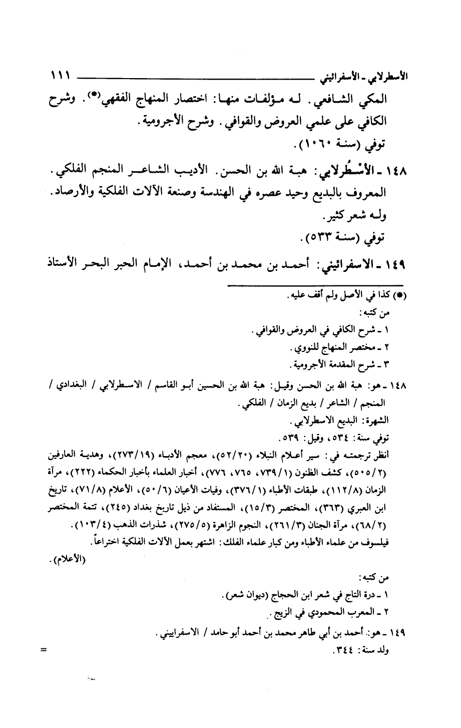 الأسطرلابي: هبة الله بن الحسن. الأديب الشاعر المنجم الفلكي. المعروف بالبديع وحيد عصره في الهندسة وصنعة الآلات الفلكية والأرصاد. وله شعر كثير.
