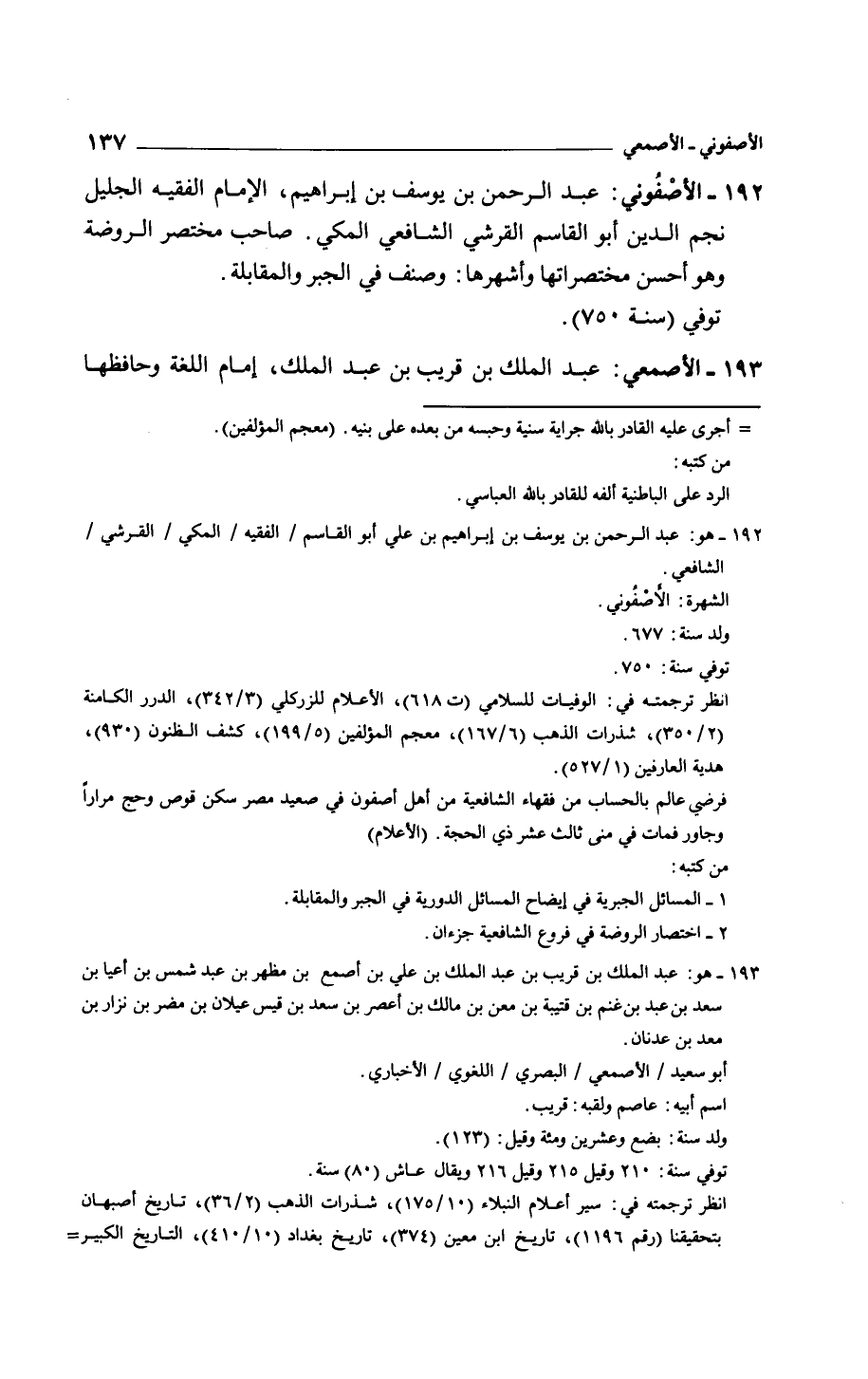 الأصفوني: عبد الرحمن بن يوسف بن إبراهيم، الإمام الفقيه الجليل نجم الدين أبو القاسم القرشي الشافعي المكي. صاحب مختصر الروضة وهو أحسن مختصراتها وأشهرها: وصنف في الجبر والمقابلة.