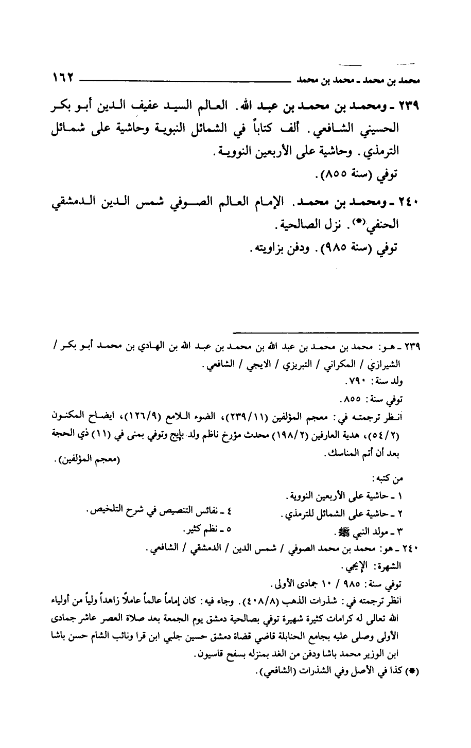 ومحمد بن محمد بن عبد الله. العالم السيد عفيف الدين أبو بكر الحسيني الشافعي. ألف كتاباً في الشمائل النبوية وحاشية على شمائل الترمذي. وحاشية على الأربعين النووية.