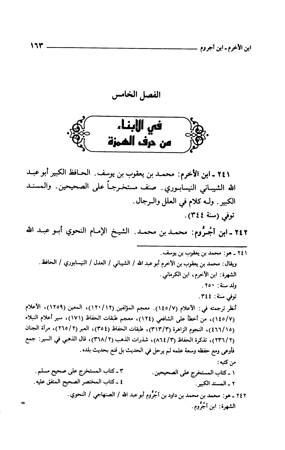 ابن الأخرم: محمد بن يعقوب بن يوسف. الحافظ الكبير أبو عبد الله الشيباني النيسابوري. صنف مستخرجاً على الصحيحين. والمسند الكبير. وله كلام في العلل والرجال.