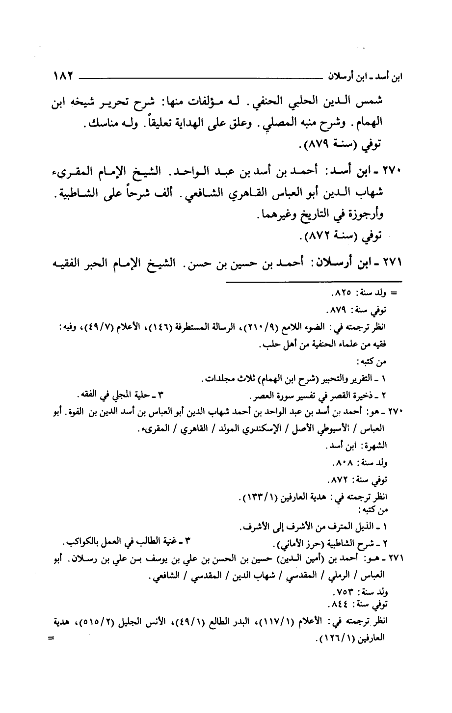 ابن أسد: أحمد بن أسد بن عبد الواحد. الشيخ الإمام المقرىء شهاب الدين أبو العباس القاهري الشافعي. ألف شرحاً على الشاطبية. وأرجوزة في التاريخ وغيرهما.