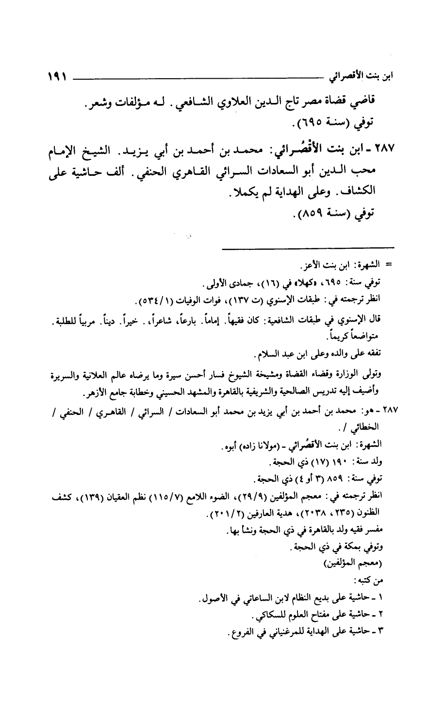 ابن بنت الأقصرائي: محمد بن أحمد بن أبي يزيد. الشيخ الإمام محب الدين أبو السعادات السرائي القاهري الحنفي. ألف حاشية على الكشاف. وعلى الهداية لم يكملا.
