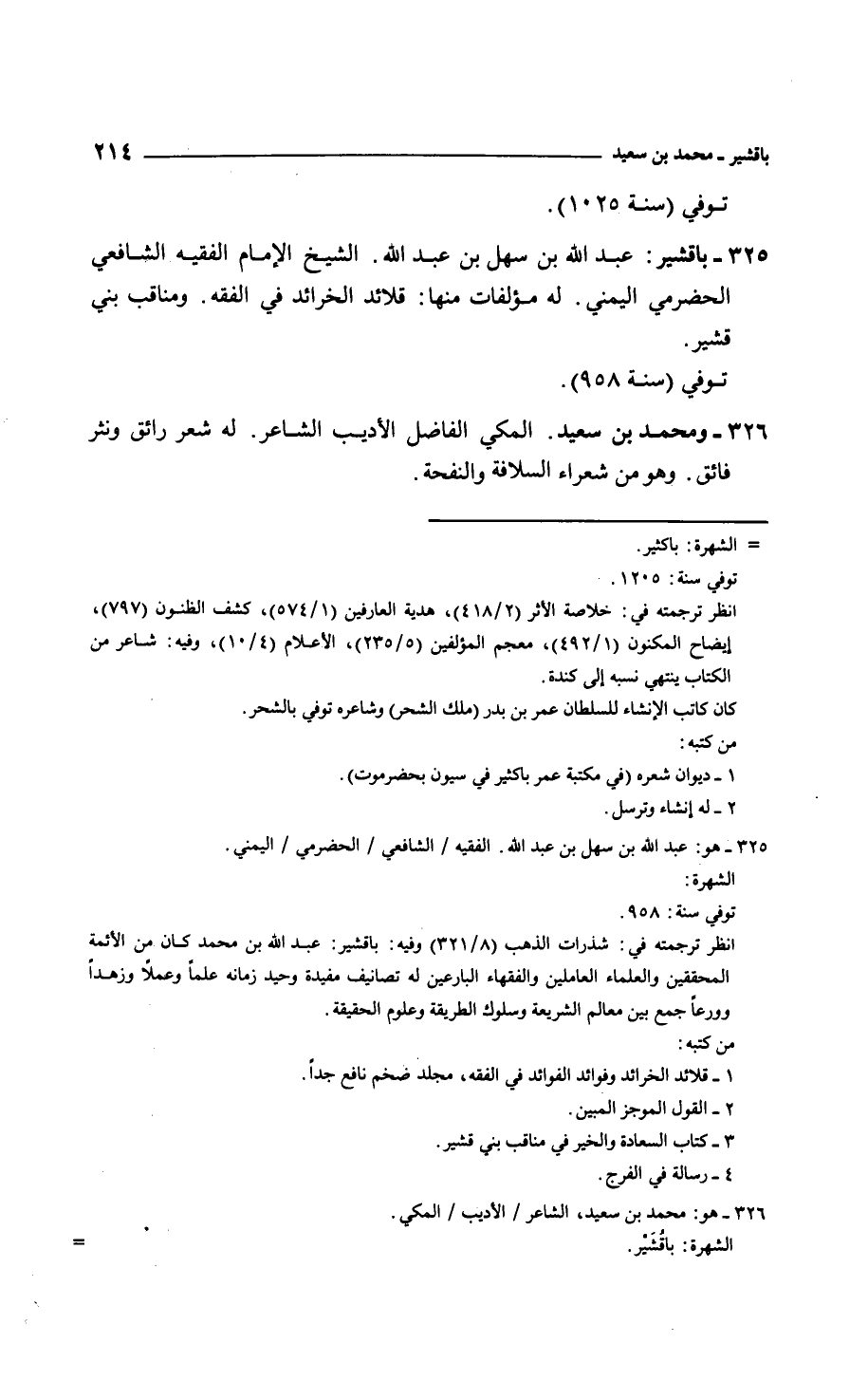 باقشير: عبد الله بن سهل بن عبد الله. الشيخ الإمام الفقيه الشافعي الحضرمي اليمني. له مؤلفات منها: قلائد الخرائد في الفقه. ومناقب بني قشير.