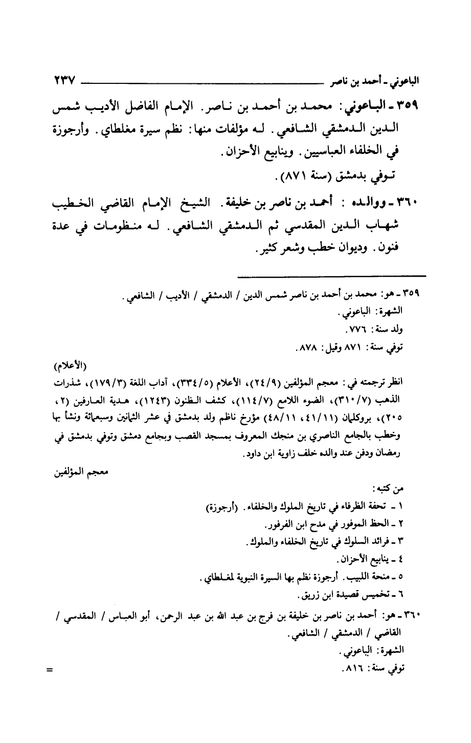 الباعوني: محمد بن أحمد بن ناصر. الإمام الفاضل الأديب شمس الدين الدمشقي الشافعي. له مؤلفات منها: نظم سيرة مغلطاي. وأرجوزة في الخلفاء العباسيين. وينابيع الأحزان.