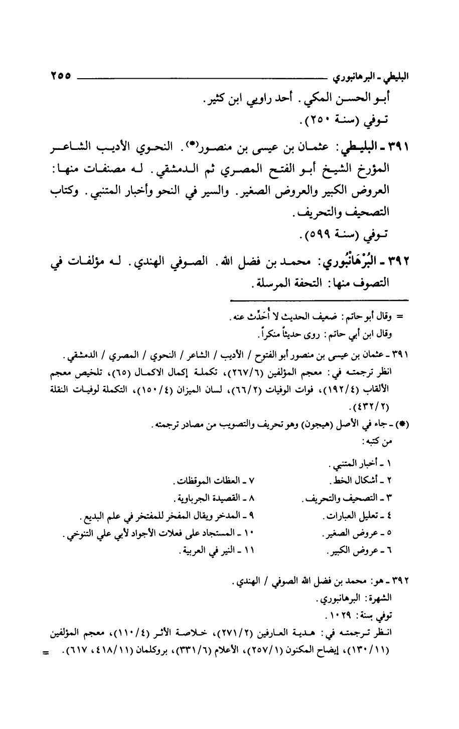 البليطي: عثمان بن عيسى بن منصور. النحوي الأديب الشاعر المؤرخ الشيخ أبو الفتح المصري ثم الدمشقي. له مصنفات منها: العروض الكبير والعروض الصغير. والسير في النحو وأخبار المتنبي. وكتاب التصحيف والتحريف.