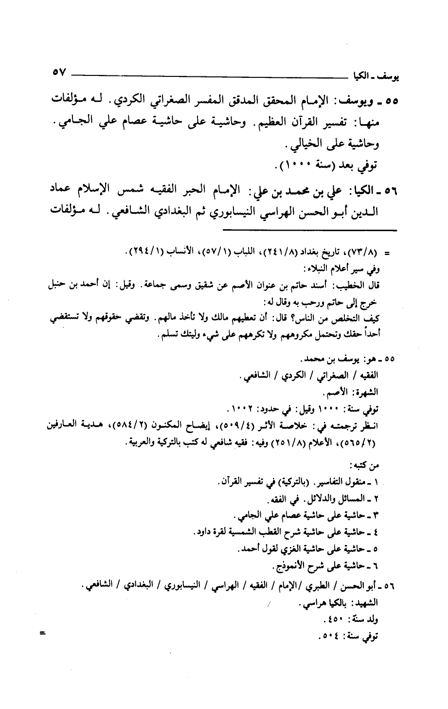 الكيا: علي بن محمد بن علي: الإمام الحبر الفقيه شمس الإسلام عماد الدين أبو الحسن الهراسي النيسابوري ثم البغدادي الشافعي. له مؤلفات