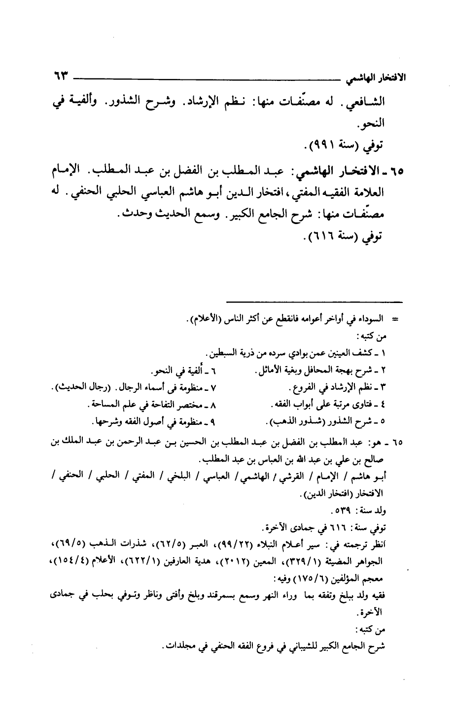 الافتخار الهاشمي: عبد المطلب بن الفضل بن عبد المطلب. الإمام العلامة الفقيه المفتي، افتخار الدين أبو هاشم العباسي الحلبي الحنفي. له مصنفات منها: شرح الجامع الكبير. وسمع الحديث وحدث.