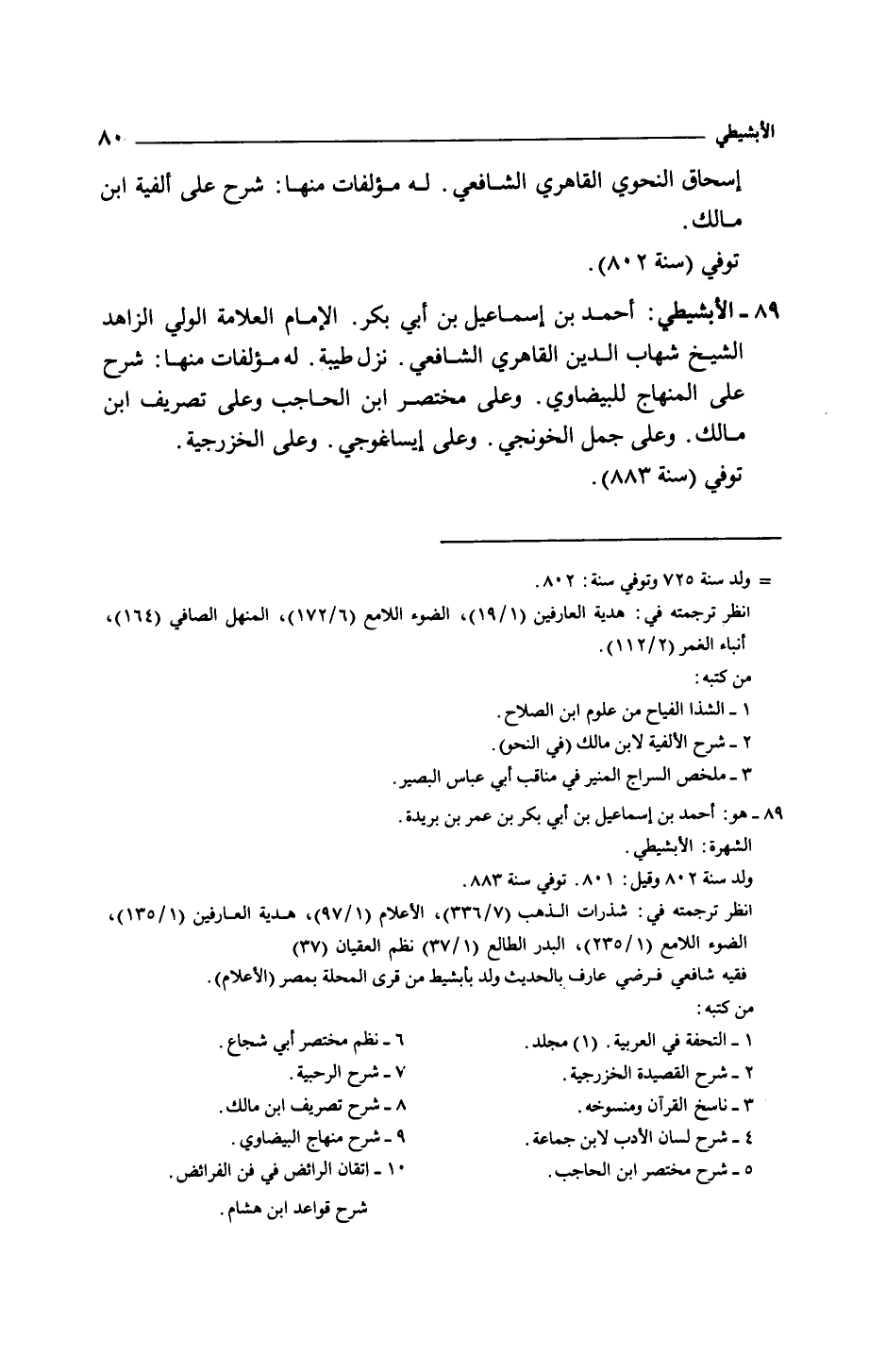الأبشيطي: أحمد بن إسماعيل بن أبي بكر. الإمام العلامة الولي الزاهد الشيخ شهاب الدين القاهري الشافعي. نزل طيبة. له مؤلفات منها: شرح على المنهاج للبيضاوي. وعلى مختصر ابن الحاجب وعلى تصريف ابن مالك. وعلى جمل الخونجي. وعلى إيساغوجي. وعلى الخزرجية.