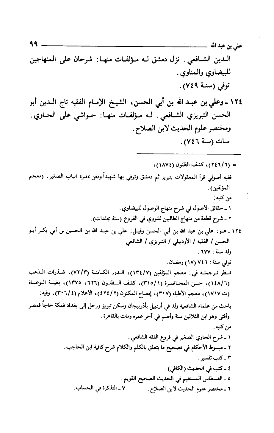 وعلي بن عبد الله بن أبي الحسن، الشيخ الإمام الفقيه تاج الدين أبو الحسن التبريزي الشافعي. له مؤلفات منها: حواشي على الحاوي. ومختصر علوم الحديث لابن الصلاح.
