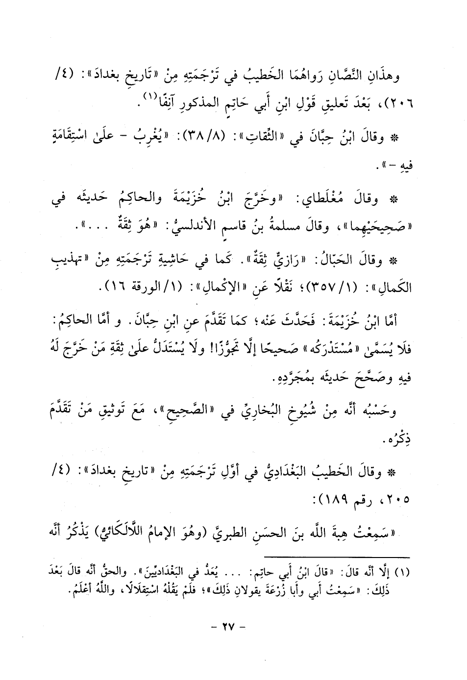 أقول: فكان يحسن بالشيخ ـ أمتع الله به ـ أن يراجع نقل «الميزان» على «مسند الشهاب» المخطوط أو المطبوع إن كان أحدهما بحضرته وقتئذ. زادنا الله وإياه حرصاً. وظني أن عثمان بن أبي شيبة ـ وحده ـ هو الذي قال: «عن مقاتل» فقد قرنه ابن أبي حاتم ـ في سؤاله لأبيه ـ بقتيبة، ولم أره عن قتيبة إلا باسمه كاملاً: (مقاتل بن حيَّان) وكذا كل من رواه عن حميد الرؤاسي والحسن بن صالح. وعثمان هو راويه عن حميد الرؤاسي عند الأزدي (¬1) فتأمل.