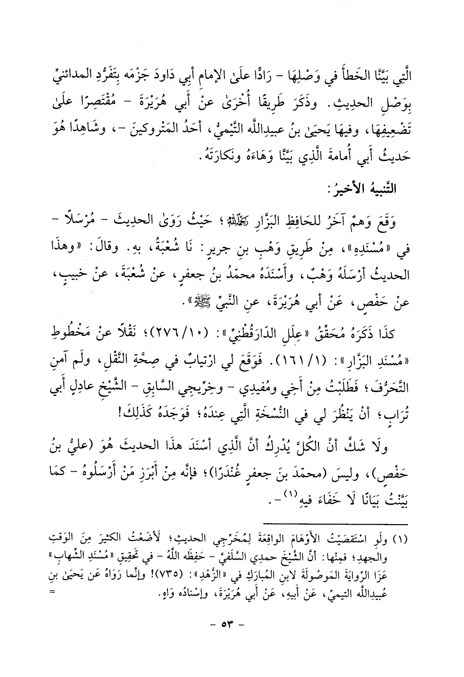 قلت: وليس ابن المبارك أو القطان بدون واحد من هؤلاء، فكيف باجتماعهما على خلاف معتمر؟ ولا يعني ما تقدم عن ابن معين أن معتمراً بمنزلة (المعصوم) في أبيه. فمالك ـ رحمه الله ـ هو أثبت أصحاب الزهري بإطلاق، ومع ذلك أخذوا عليه في الزهري أشياء وأبو معاوية الضرير رفعوه جداً في الأعمش ـ وحده ـ ومع ذلك لم يسلم من بعض الوهم في حديثه.