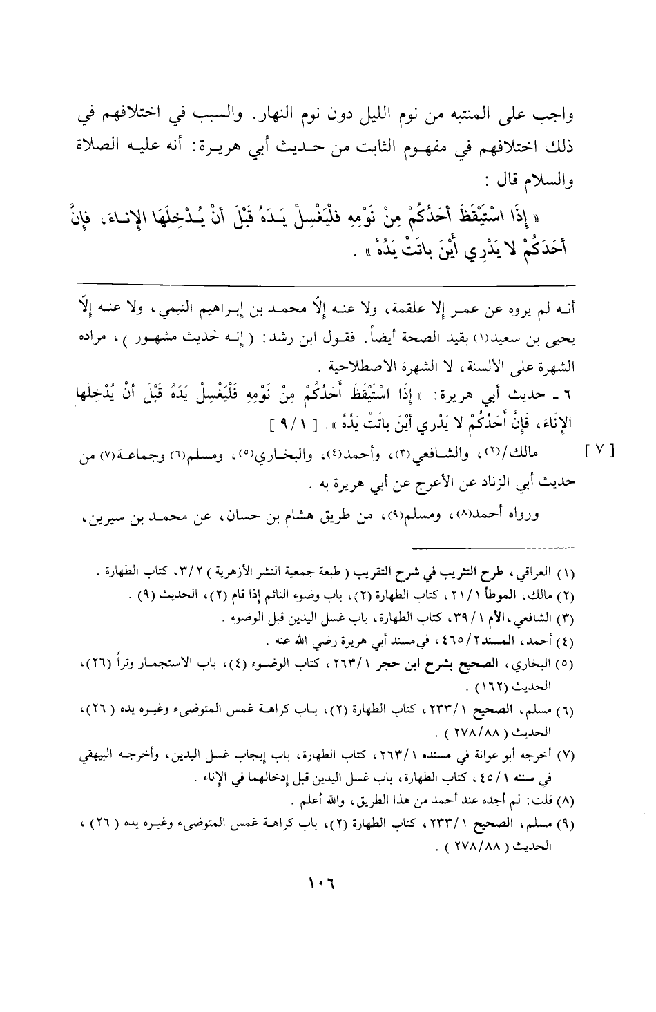 6 - حديث أبي هريرة: "إِذَا اسْتَيْقَظَ أَحَدُكُمْ مِنْ نَوْمِهِ فَلْيَغْسِلْ يَدَهُ قَبْلَ أنْ يُدْخِلَها الإِناءَ، فَإِنَّ أَحَدُكُمْ لا يَدْري أيْنَ باتَتْ يَدُهُ".