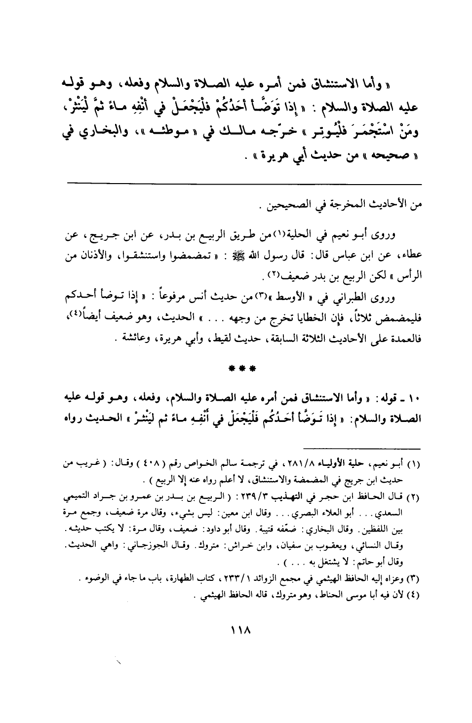 10 - قوله: "وأما الاستنشاق فمن أمره -عليه الصلاة والسلام-، وفعله، وهو قوله -عليه الصلاة والسلام-: "إذا تَوَضَّأ أحَدُكُم فَلْيَجْعَلْ في أنْفِهِ ماءً ثم ليَنْثرْ" الحديث رواه