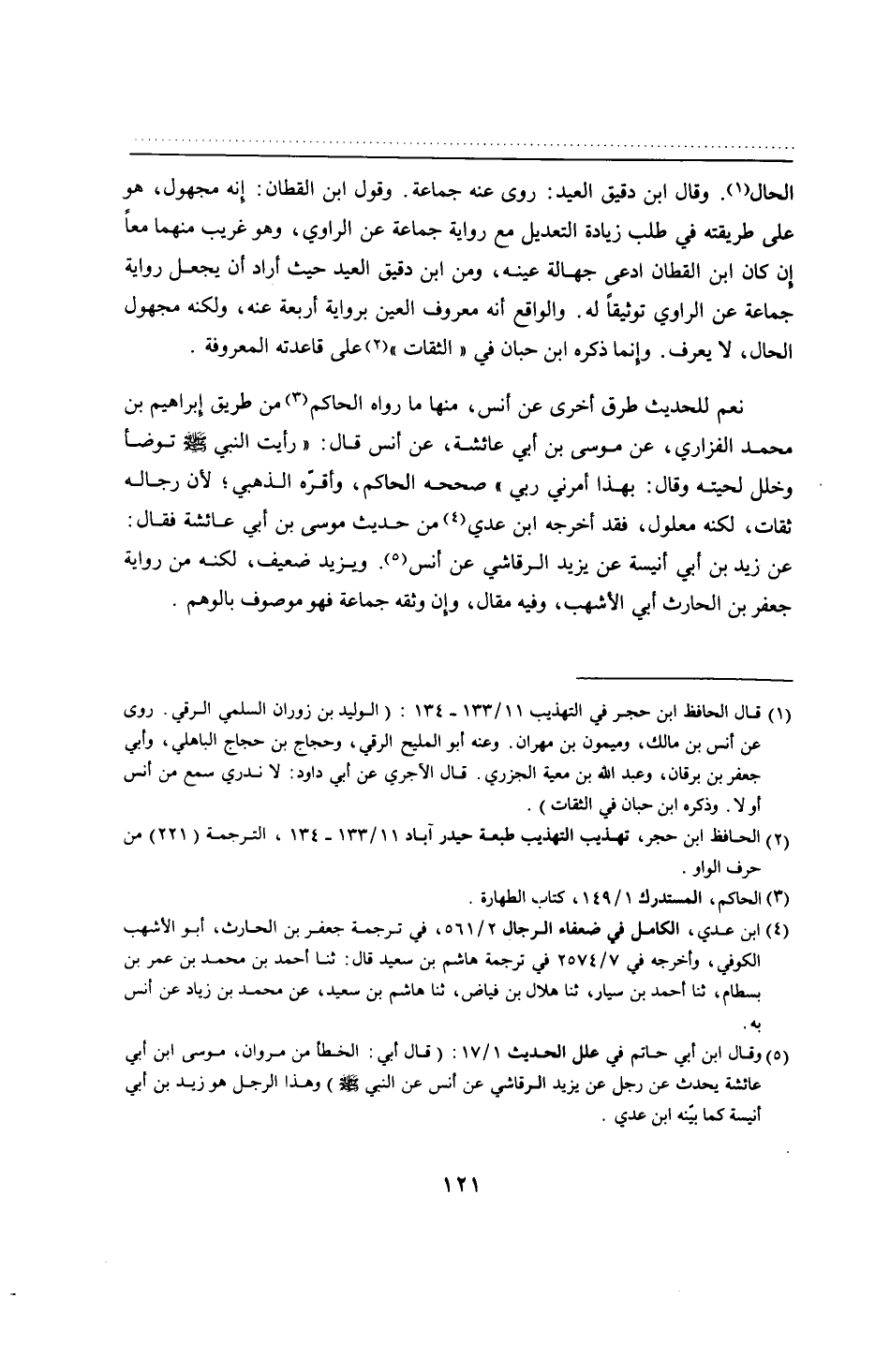 الحال. وقال ابن دقيق العيد: روى عنه جماعة. وقول ابن القطان: إنه مجهول، هو على طريقته في طلب زيادة التعديل مع رواية جماعة عن الراوي، وهو غريب منهما معًا إن كان ابن القطان ادعى جهالة عينه، ومن ابن دقيق العيد حيث أراد أن يجعل رواية جماعة عن الراوي توثيقًا له. والواقع أنه معروف العين برواية أربعة عنه، ولكنه مجهول الحال، لا يعرف. وإنما ذكره ابن حبان في "الثقات" على قاعدته المعروفة.