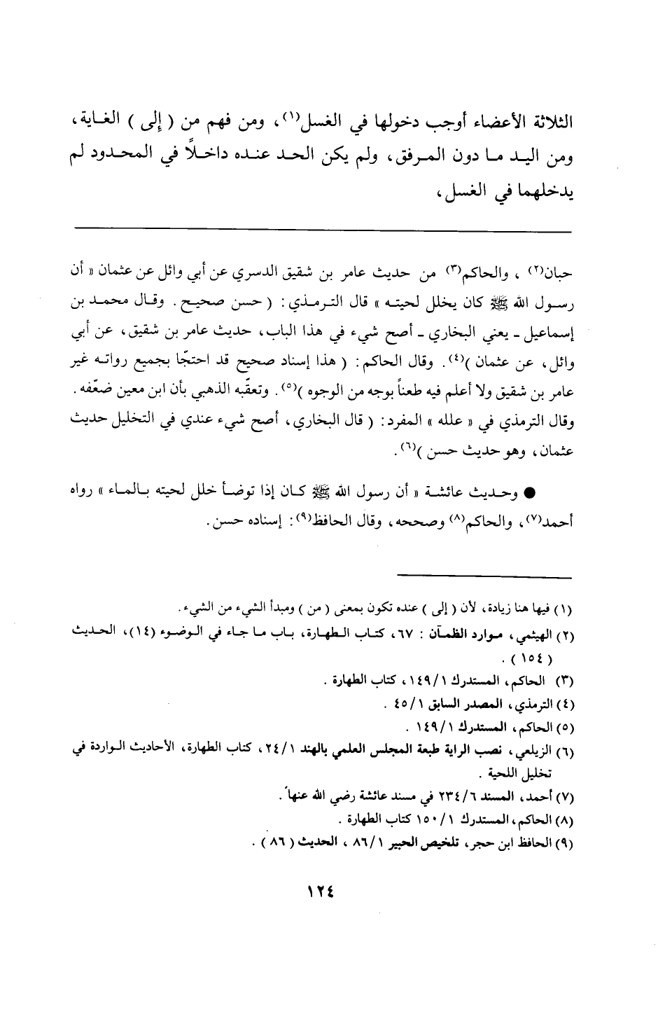 • وحديث عائشة "أن رسول الله - صلى الله عليه وسلم - كان إذا توضأ خلل لحيته بالماء" رواه أحمد، والحاكم وصححه، وقال الحافظ: إسناده حسن.