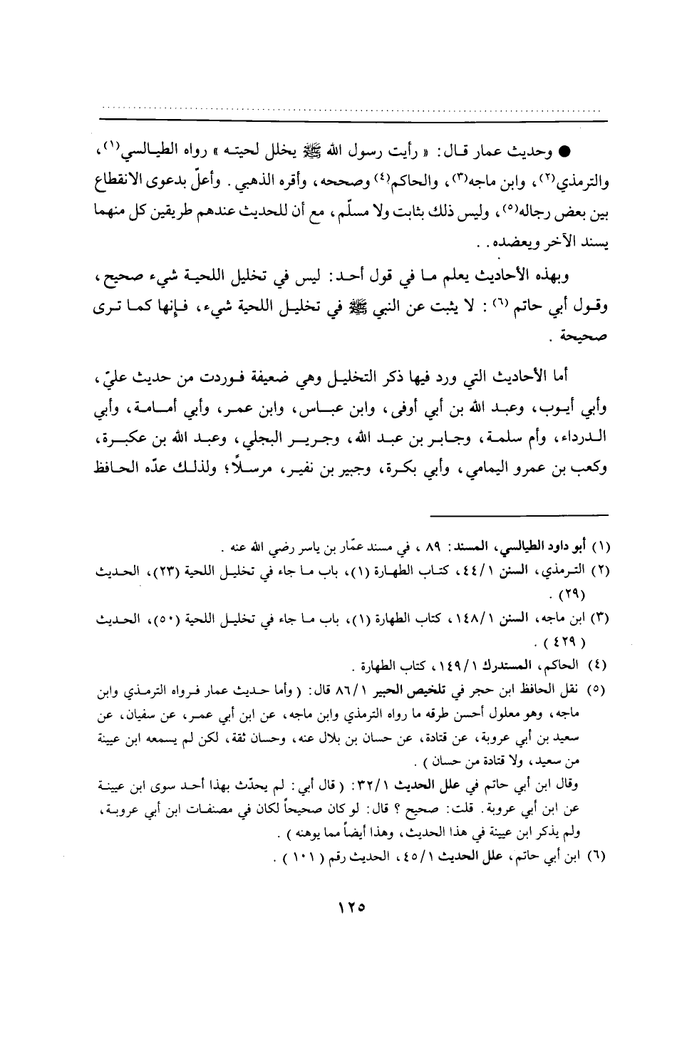 • وحديث عمار قال: "رأيت رسول الله - صلى الله عليه وسلم - يخلل لحيته" رواه الطيالسي، والترمذي)، وابن ماجه، والحاكم وصححه، وأقره الذهبي. وأعلّ بدعوى الانقطاع بين بعض رجاله، وليس ذلك بثابت ولا مسلّم، مع أن للحديث عندهم طريقين كل منهما يسند الآخر ويعضده ..