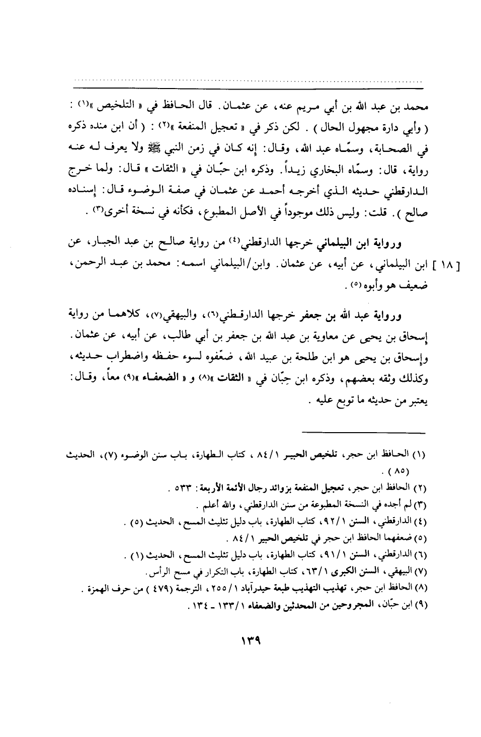 ورواية ابن البيلماني خرجها الدارقطني من رواية صالح بن عبد الجبار، عن ابن البيلماني، عن أبيه، عن عثمان. وابن البيلماني اسمه: محمد بن عبد الرحمن، ضعيف هو وأبوه.