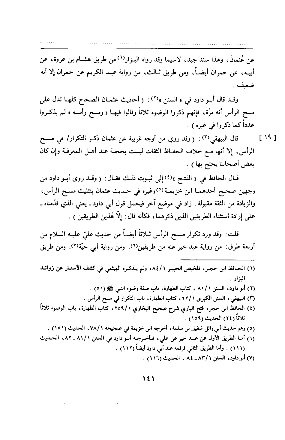 قال الحافظ في "الفتح" إِلى ثبوت ذلك فقال: (وقد روى أبو داود من وجهين صحح أحدهما ابن خزيمة وغيره في حديث عثمان بتثليث مسح الرأس، والزيادة من الثقة مقبولة. زاد في موضع آخر فيحمل قول أبي داود -يعني الذي قدّمناه- على إرادة استثناء الطريقين الذين ذكرهما، فكأنه قال: إلَّا هذين الطريقين).