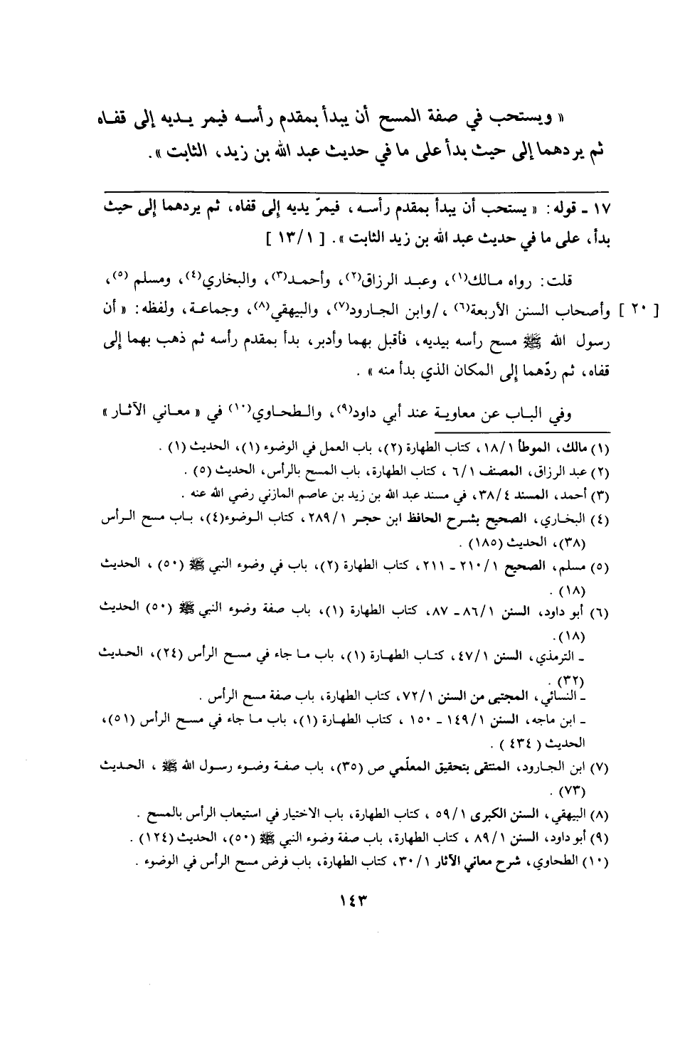 17 - قوله: "يستحب أن يبدأ بمقدم رأسه، فيمر يديه إِلى قفاه، ثم يردهما إلى حيث بدأ، على ما في حديث عبد الله بن زيد الثابت".