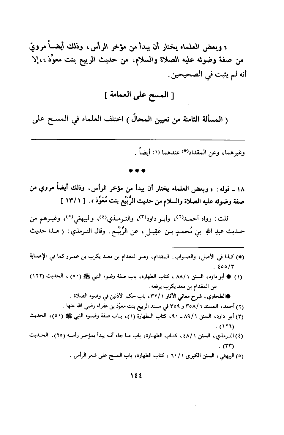 18 - قوله: "وبعض العلماء يختار أن يبدأ من مؤخر الرأس، وذلك أيضًا مروي من صفة وضوئه -عليه الصلاة والسلام- من حديث الرُّبَيِّع بنت مُعَوِّذ".