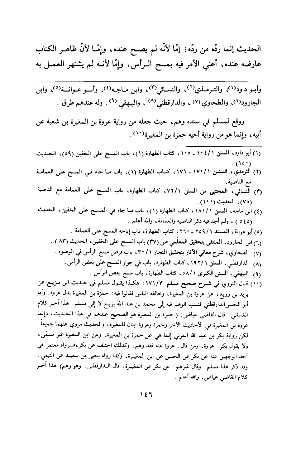 ووقع لمسلم في سنده وهم، حيث جعله من رواية عروة بن المغيرة بن شعبة عن أبيه، وإنما هو من رواية أخيه حمزة بن المغيرة.