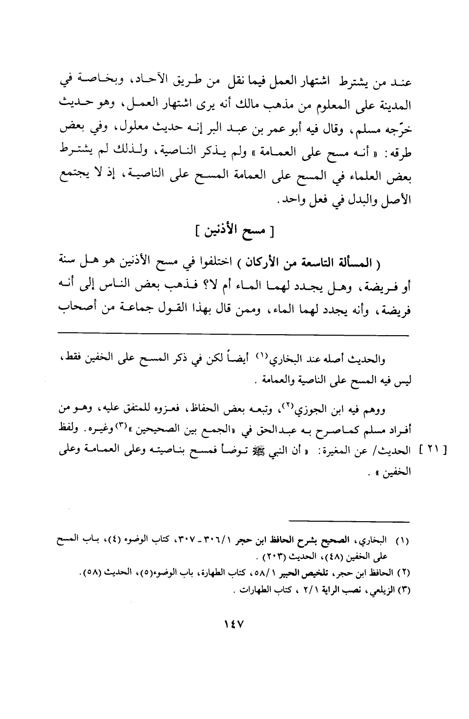 ووهم فيه ابن الجوزي، وتبعه بعض الحفاظ، فعزوه للمتفق عليه، وهو من أفراد مسلم كما صرح به عبد الحق في "الجمع بين الصحيحين" وغيره. ولفظ الحديث عن المغيرة: "أن النبي - صلى الله عليه وسلم - توضأ فمسح بناصيته وعلى العمامة وعلى الخفين".