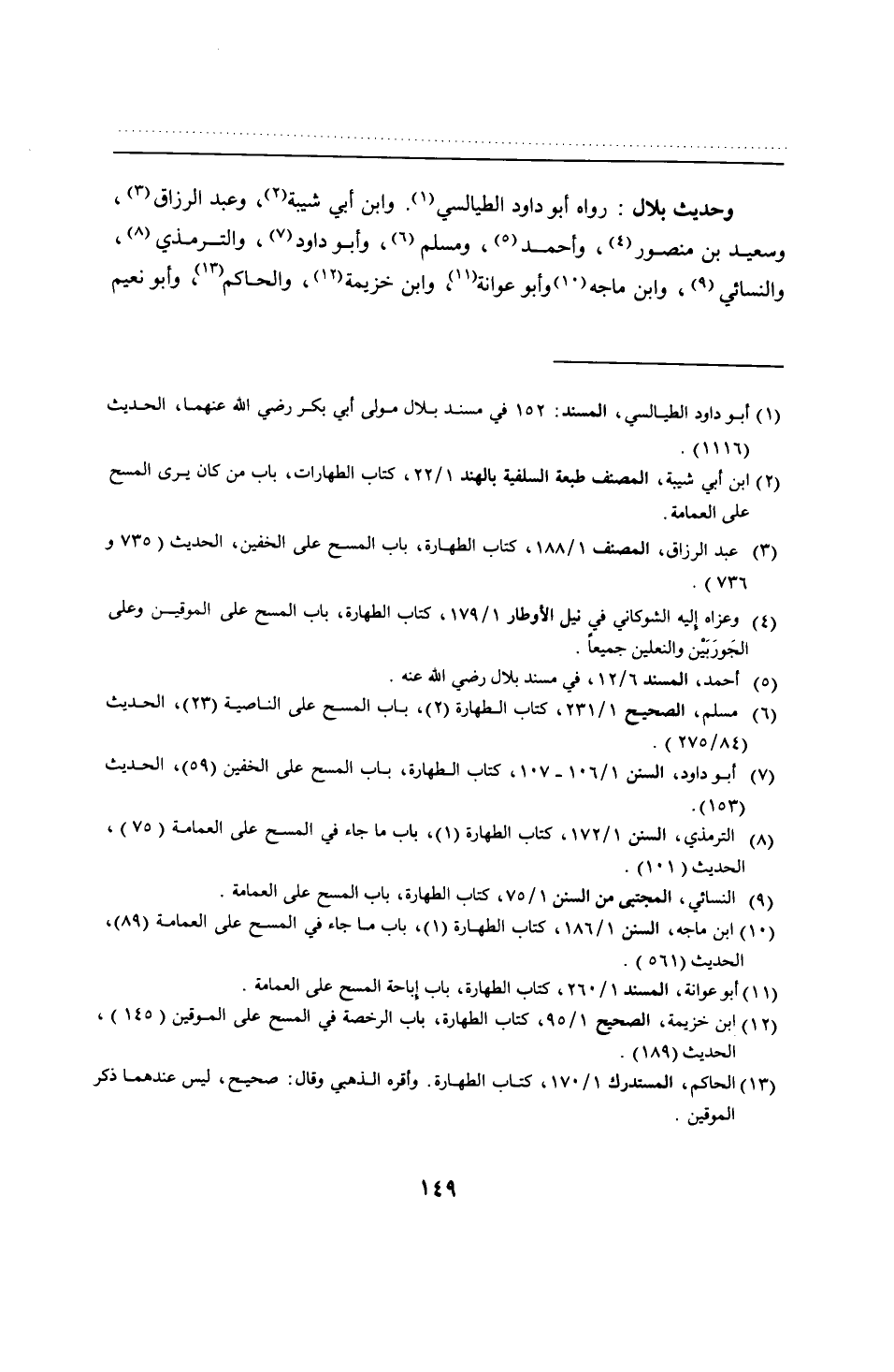 وحديث بلال: رواه أبو داود الطيالسي. وابن أبي شيبة، وعبد الرزاق، وسعيد بن منصور، وأحمد، ومسلم، وأبو داود، والترمذي، والنسائي، وابن ماجه وأبو عوانة , وابن خزيمة، والحاكم , وأبو نعيم