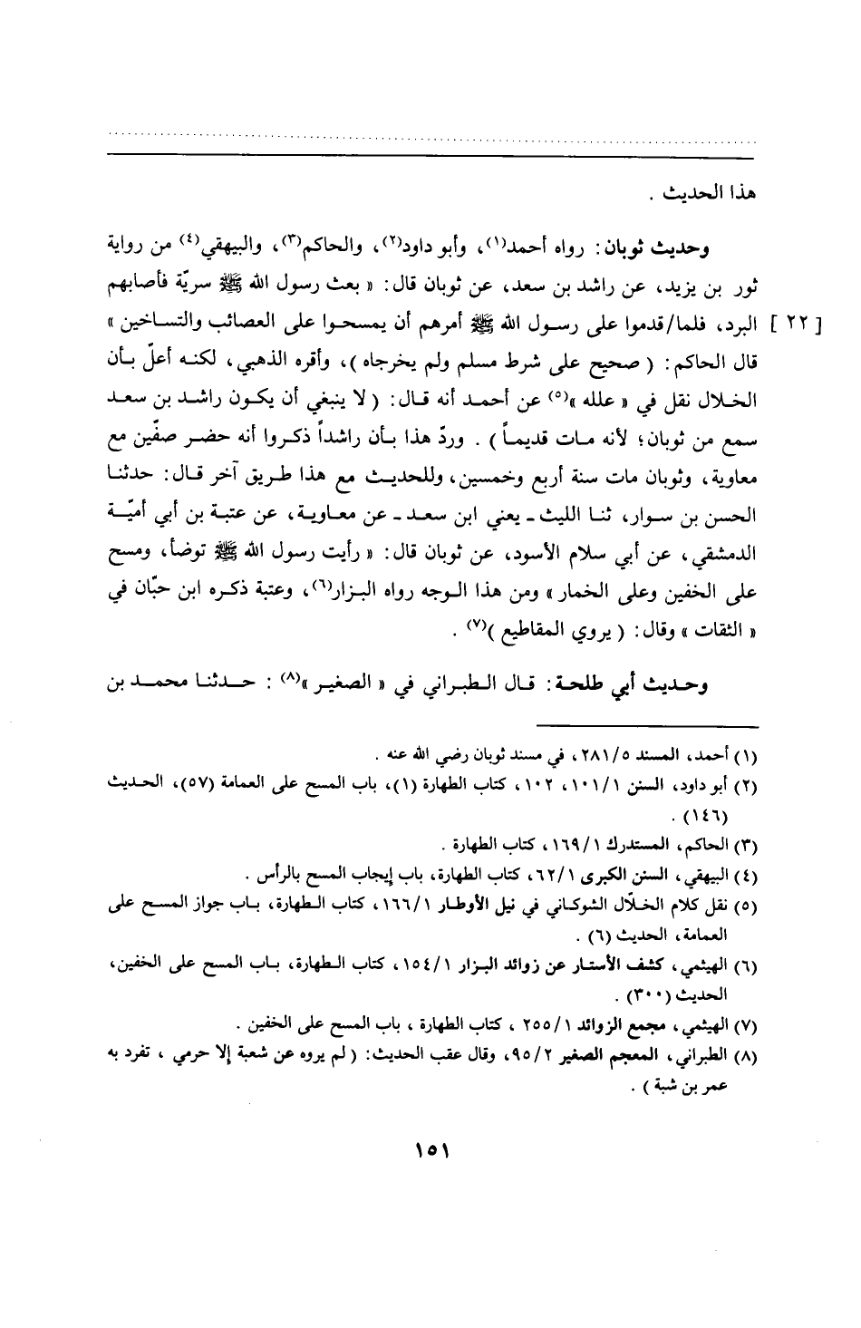 وحديث ثوبان: رواه أحمد، وأبو داود، والحاكم، والبيهقي من رواية ثور بن يزيد، عن راشد بن سعد، عن ثوبان قال: "بعث رسول الله - صلى الله عليه وسلم - سريّة فأصابهم البرد، فلما قدموا على رسول الله - صلى الله عليه وسلم - أمرهم أن يمسحوا على العصائب والتساخين" قال الحاكم: (صحيح على شرط مسلم ولم يخرجاه)، وأقره الذهبي، لكنه أعلّ بأن الخلال نقل في "علله" عن أحمد أنه قال: (لا ينبغي أن يكون راشد بن سعد سمع من ثوبان؛ لأنه مات قديمًا). وردّ هذا بأن راشدًا ذكروا أنه حضر صفّين مع معاوية، وثوبان مات سنة أربع وخمسين، وللحديث مع هذا طريق آخر قال: حدثنا الحسن بن سوار، ثنا الليث -يعني ابن سعد- عن معاوية، عن عتبة بن أبي أميّة الدمشقي، عن أبي سلام الأسود، عن ثوبان قال: "رأيت رسول الله - صلى الله عليه وسلم - توضأ، ومسح على الخفين وعلى الخمار" ومن هذا الوجه رواه البزار، وعتبة ذكره ابن حبّان في "الثقات" وقال: (يروي المقاطيع).